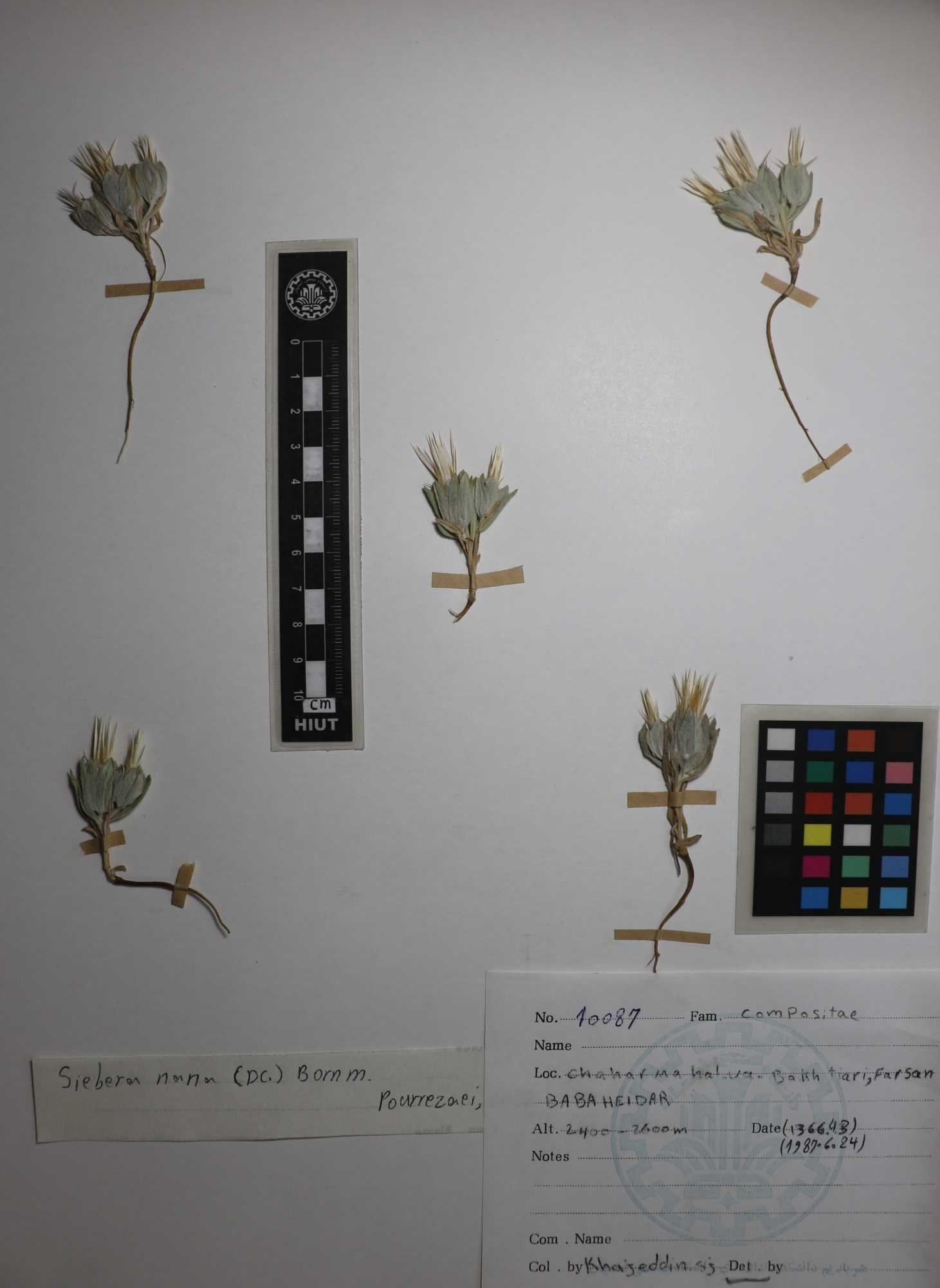 10087 Family : Asteraceae (Compositae) Herbarium Number : 10087 Species Name : Siebera nana (Dc.)Bornm. herbarium date 6/24/1987 herbarium alternate 2400_2600m herbarium col by S.J.Khajeddin herbarium det by herbarium country Iran herbarium province Chahar mahal_va_bakhtiary herbarium location Farsan herbarium lat herbarium long herbarium annotations