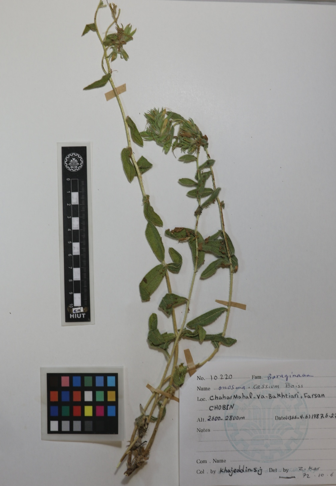 10220 Family : Boraginaceae Herbarium Number : 10220 Species Name : Onosma cassium Boiss. herbarium date not inserted herbarium alternate herbarium col by herbarium det by herbarium country Iran herbarium province herbarium location not inserted herbarium lat herbarium long herbarium annotations