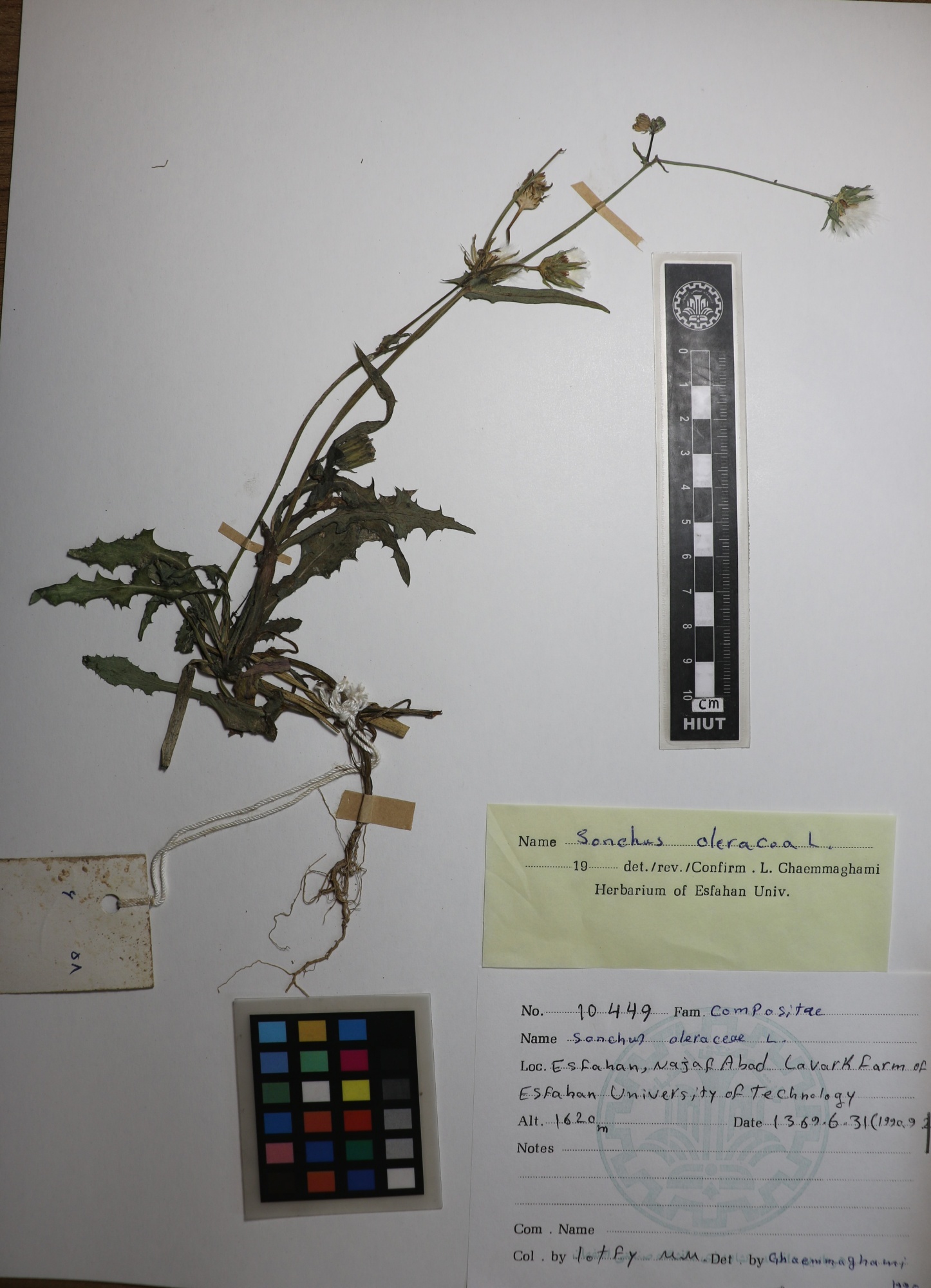 10449 Family : Asteraceae (Compositae) Herbarium Number : 10449 Species Name : Sonchus oleracea L. herbarium date 9/2/1990 herbarium alternate 1620m herbarium col by S.J.Khajeddin herbarium det by J.Pourrezaei herbarium country Iran herbarium province Isfahan herbarium location Najaf abad herbarium lat herbarium long herbarium annotations