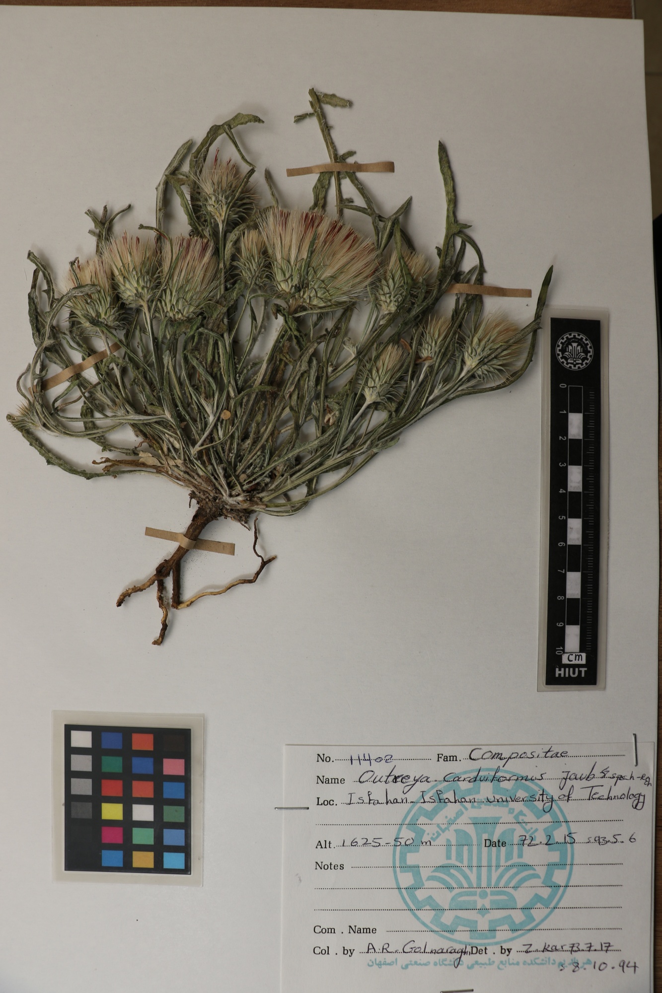 11402 Family : Asteraceae (Compositae) Herbarium Number : 11402 Species Name : Outreya carduiformis Jaub. & Spach. herbarium date 5/6/1993 herbarium alternate 1625_1650m herbarium col by herbarium det by Z.Kar herbarium country Iran herbarium province Isfahan herbarium location Isfahan university of technology herbarium lat herbarium long herbarium annotations
