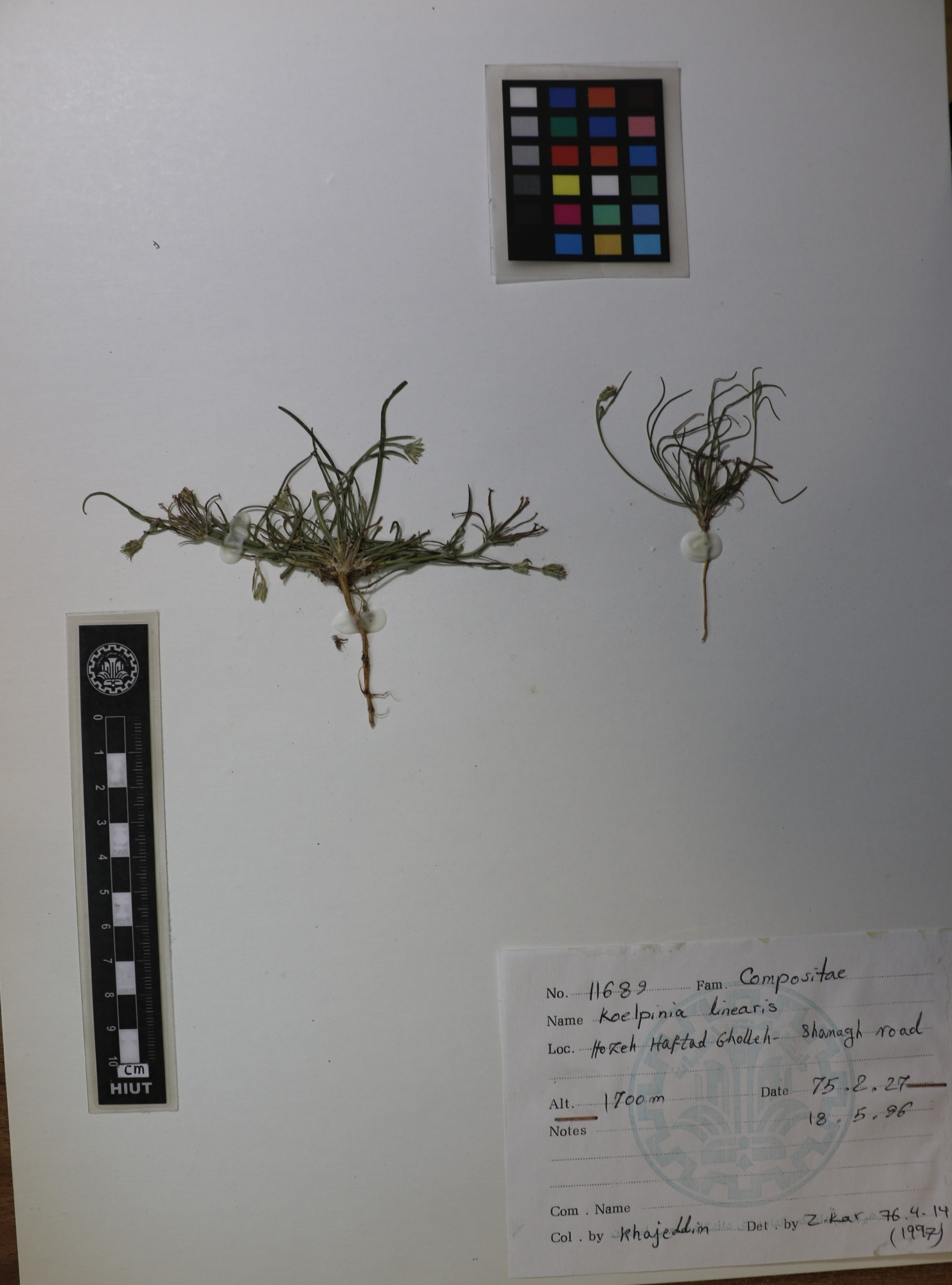 11689 Family : Asteraceae (Compositae) Herbarium Number : 11689 Species Name : Koelpinia linearis herbarium date 5/18/1996 herbarium alternate 1700m herbarium col by S.J.Khajeddin herbarium det by Z.Kar herbarium country Iran herbarium province Hozeh haftad gholleh herbarium location Shangh road herbarium lat herbarium long herbarium annotations