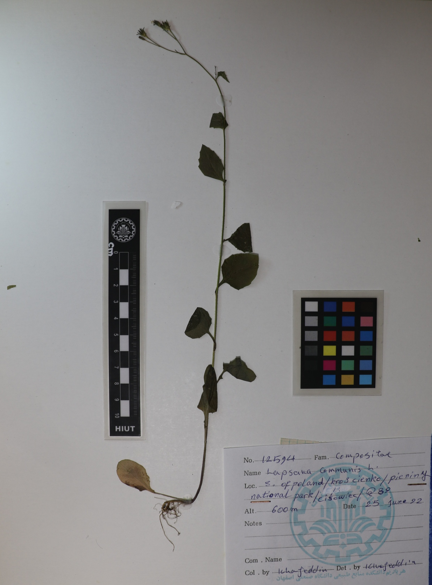 12594 Family : Asteraceae (Compositae) Herbarium Number : 12594 Species Name : Lapsaua communis H. herbarium date 6/25/1992 herbarium alternate 600m herbarium col by S.J.Khajeddin herbarium det by S.J.Khajeddin herbarium country Iran herbarium province herbarium location not inserted herbarium lat herbarium long herbarium annotations