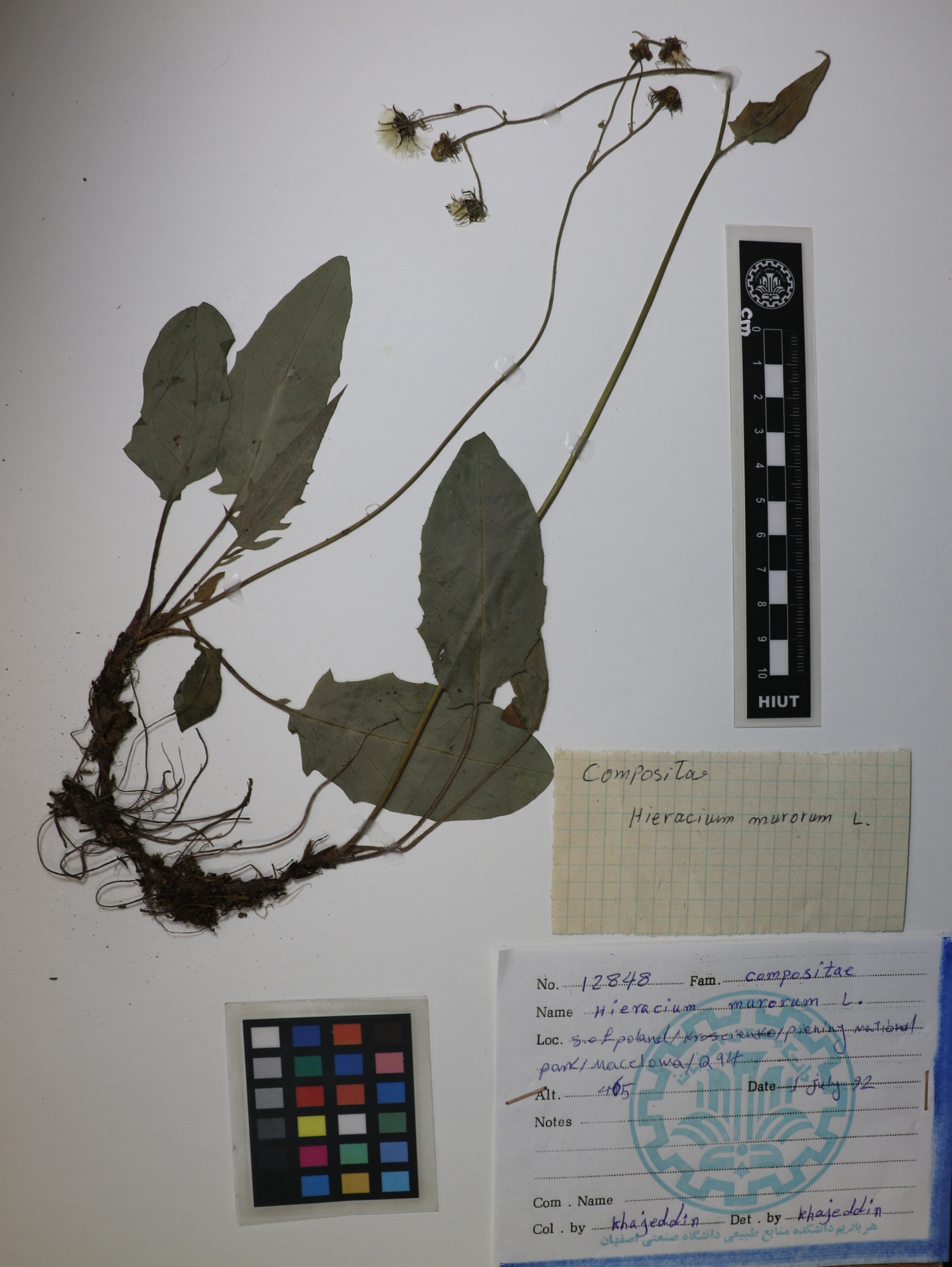 12848 Family : Asteraceae (Compositae) Herbarium Number : 12848 Species Name : Hieracium murorum L. herbarium date 7/1/1992 herbarium alternate 465m herbarium col by S.J.Khajeddin herbarium det by Khajeddin herbarium country Iran herbarium province herbarium location not inserted herbarium lat herbarium long herbarium annotations