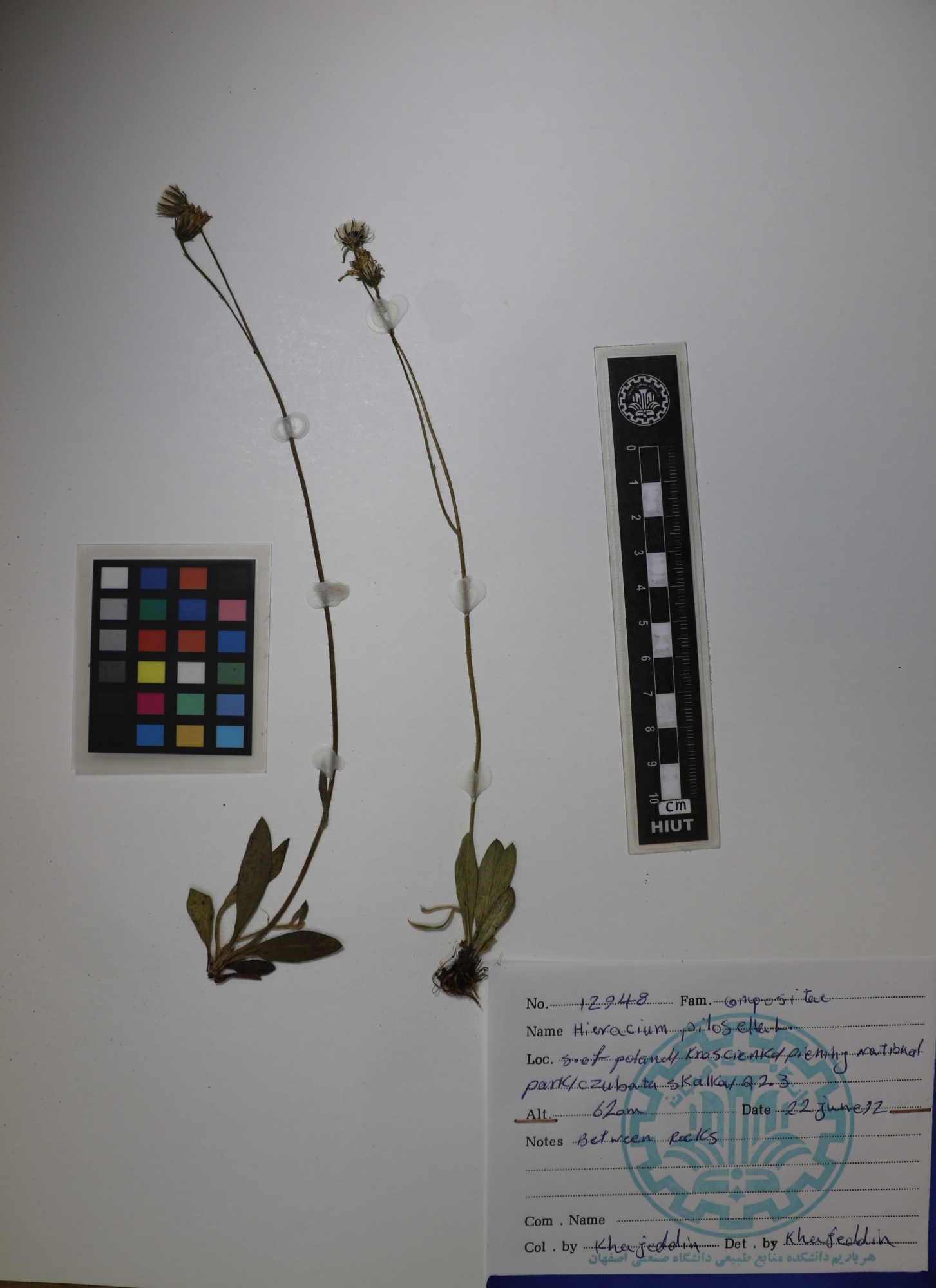 12948 Family : Asteraceae (Compositae) Herbarium Number : 12948 Species Name : Hieracium pilosella L. herbarium date 6/22/1992 herbarium alternate 620m herbarium col by S.J.Khajeddin herbarium det by Khajeddin herbarium country Iran herbarium province herbarium location not inserted herbarium lat herbarium long herbarium annotations