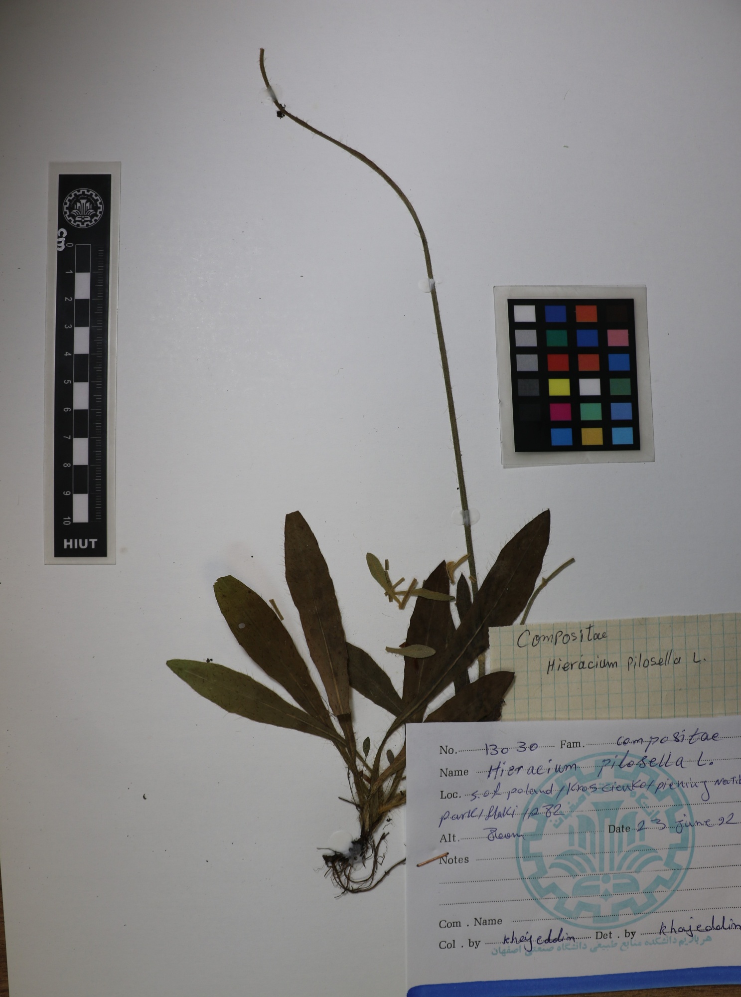 13030 Family : Asteraceae (Compositae) Herbarium Number : 13030 Species Name : Hieracium pilosella L. herbarium date 6/23/1992 herbarium alternate 800m herbarium col by S.J.Khajeddin herbarium det by Khajeddin herbarium country Europe herbarium province herbarium location not inserted herbarium lat herbarium long herbarium annotations