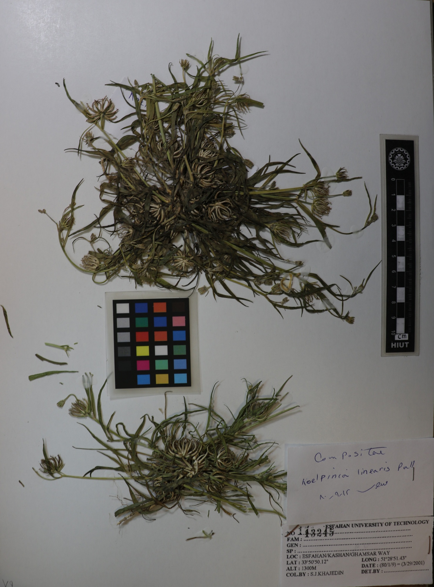13245 Family : Asteraceae (Compositae) Herbarium Number : 13245 Species Name : Koelpinia linearis herbarium date 3/29/2001 herbarium alternate 1300m herbarium col by S.J.Khajeddin herbarium det by S.J.Khajeddin herbarium country Iran herbarium province Isfahan herbarium location Kashan herbarium lat herbarium long herbarium annotations