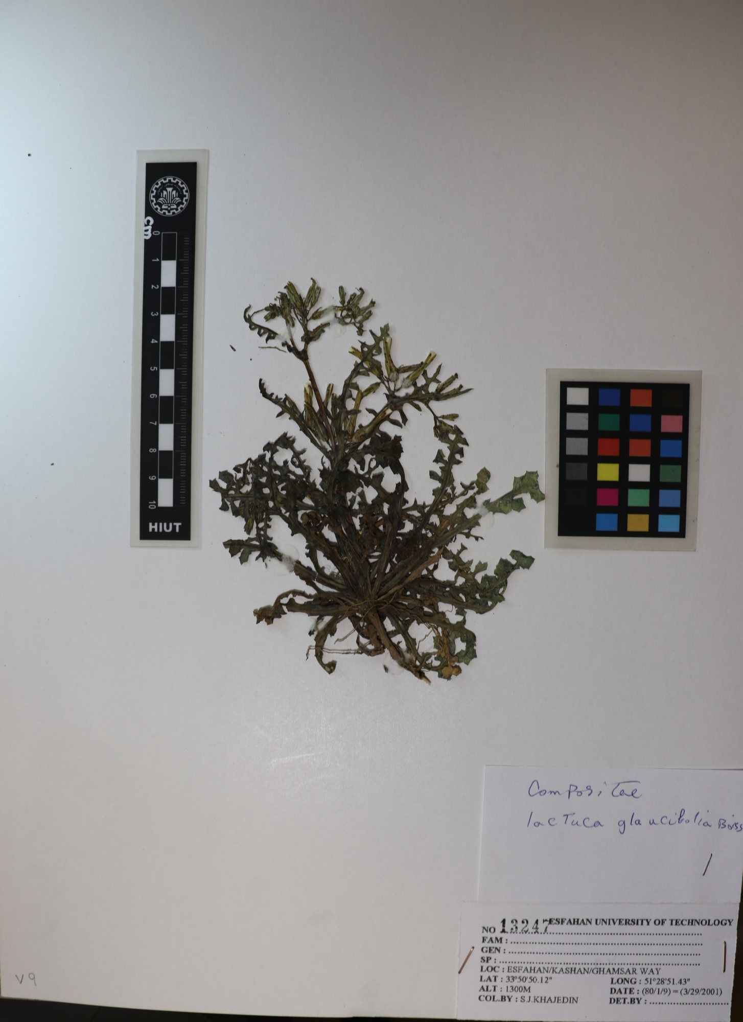 13247 Family : Asteraceae (Compositae) Herbarium Number : 13247 Species Name : Lactuca glaucifolia Boiss. herbarium date 3/29/2001 herbarium alternate 1300m herbarium col by S.J.Khajeddin herbarium det by herbarium country Iran herbarium province Isfahan herbarium location Kashan herbarium lat herbarium long herbarium annotations