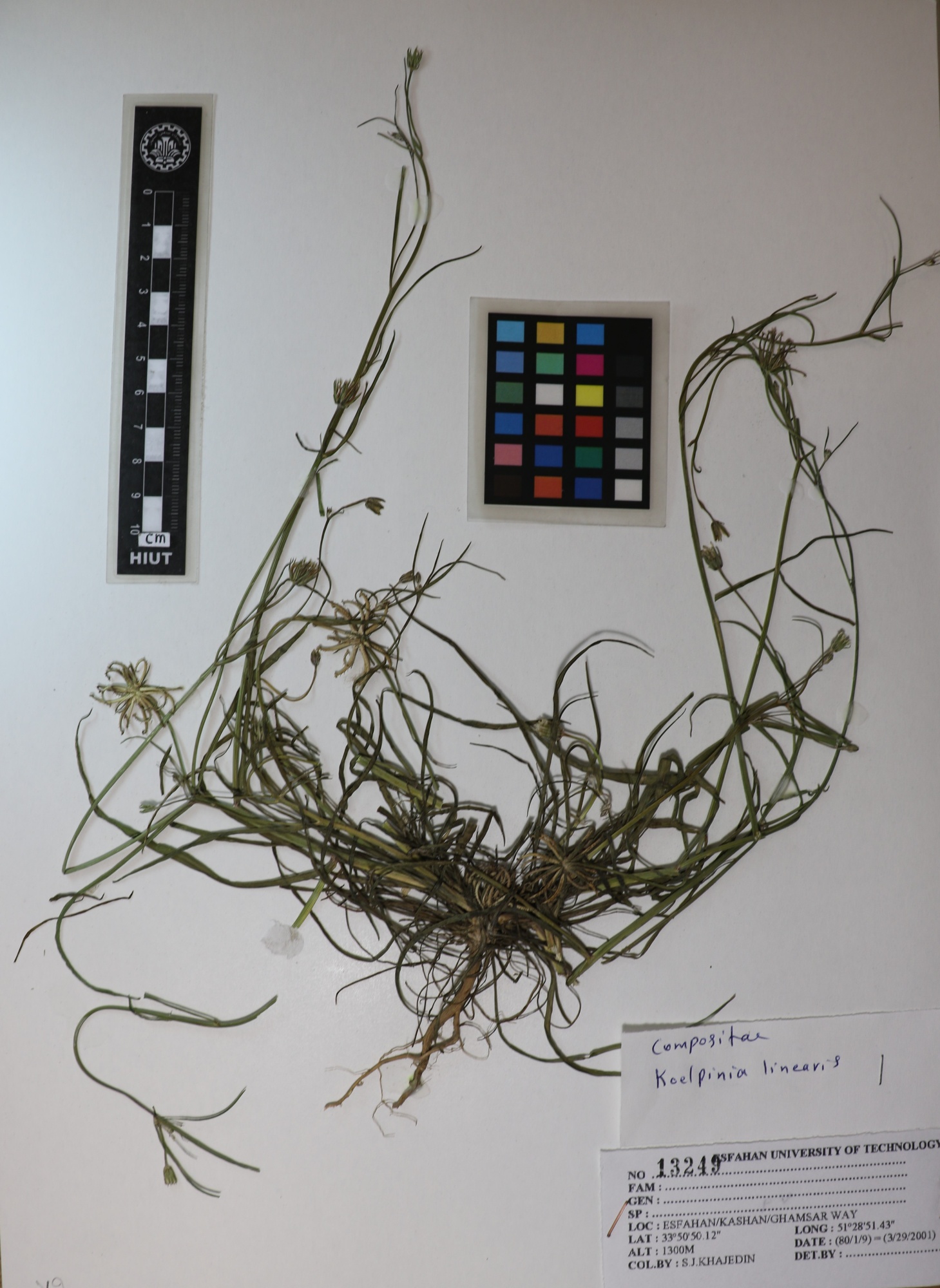 13249 Family : Asteraceae (Compositae) Herbarium Number : 13249 Species Name : Koelpinia linearis herbarium date 3/29/2001 herbarium alternate 1300m herbarium col by S.J.Khajeddin herbarium det by herbarium country Iran herbarium province Isfahan herbarium location Kashan herbarium lat herbarium long herbarium annotations
