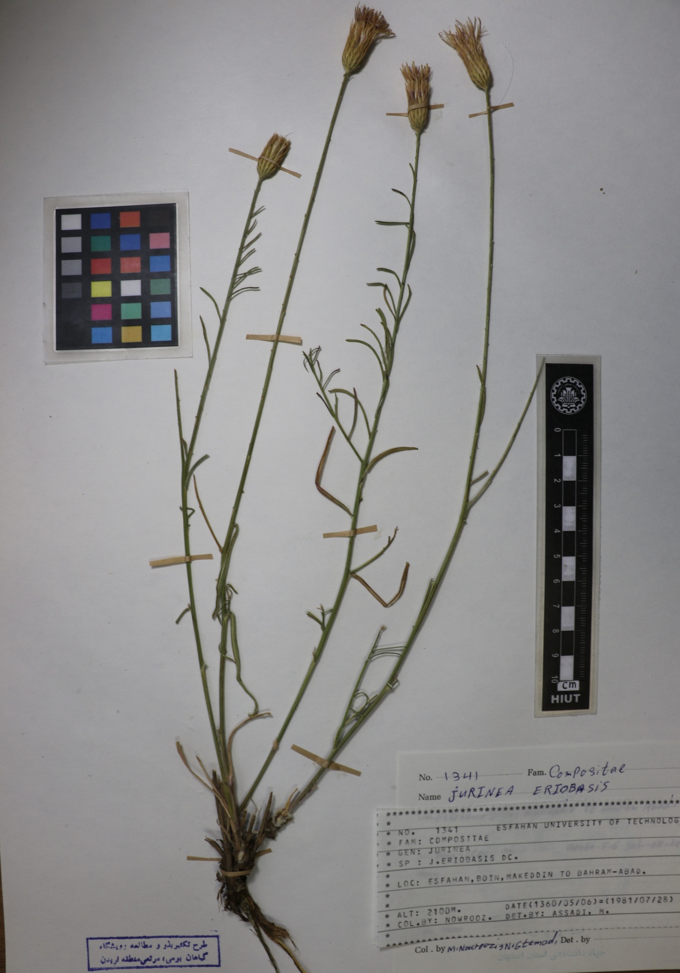 1341 Family : Asteraceae (Compositae) Herbarium Number : 1341 Species Name : Jurinea eriobasis Dc. herbarium date 7/28/1981 herbarium alternate 2100m herbarium col by M.Nowroozi herbarium det by M.Assadi herbarium country Iran herbarium province Isfahan herbarium location Boin.Makeddin to Bahram_Abad herbarium lat herbarium long herbarium annotations