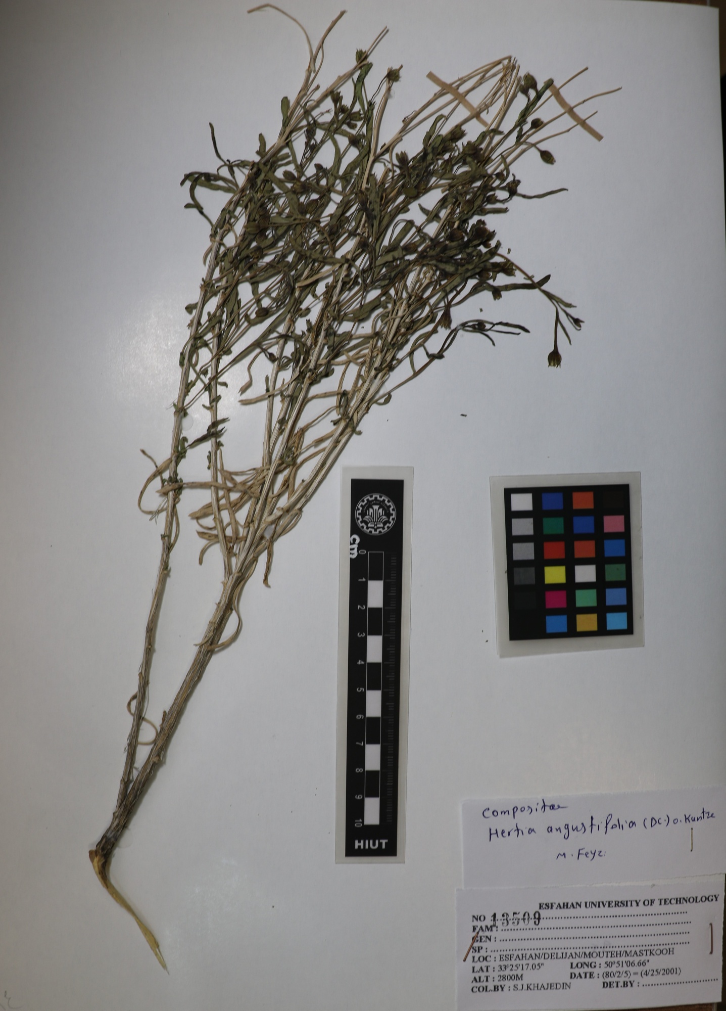 13509 Family : Asteraceae (Compositae) Herbarium Number : 13509 Species Name : Hertia angustifolia (Dc.)Q.Kuntye. herbarium date 4/25/2001 herbarium alternate 2800m herbarium col by S.J.Khajeddin herbarium det by herbarium country Iran herbarium province Isfahan herbarium location Delijan herbarium lat herbarium long herbarium annotations