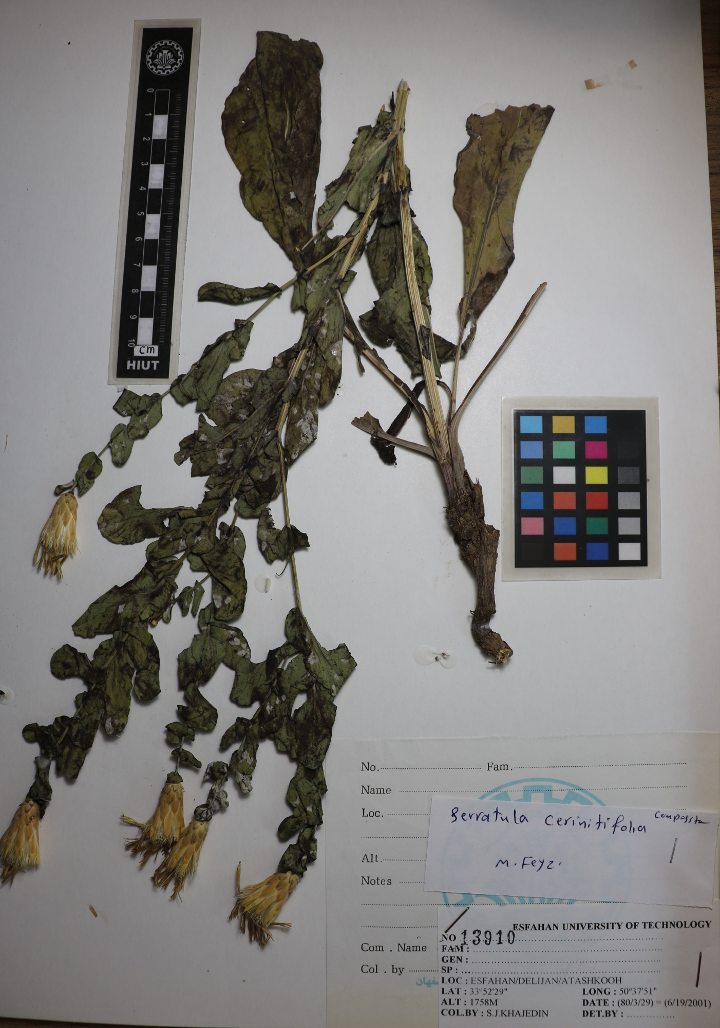13910 Family : Asteraceae (Compositae) Herbarium Number : 13910 Species Name : Serratula cerinthifolia herbarium date 6/19/2001 herbarium alternate 1758m herbarium col by Mahshanian herbarium det by herbarium country Iran herbarium province Isfahan herbarium location Delijan/Atashkooh herbarium lat herbarium long herbarium annotations