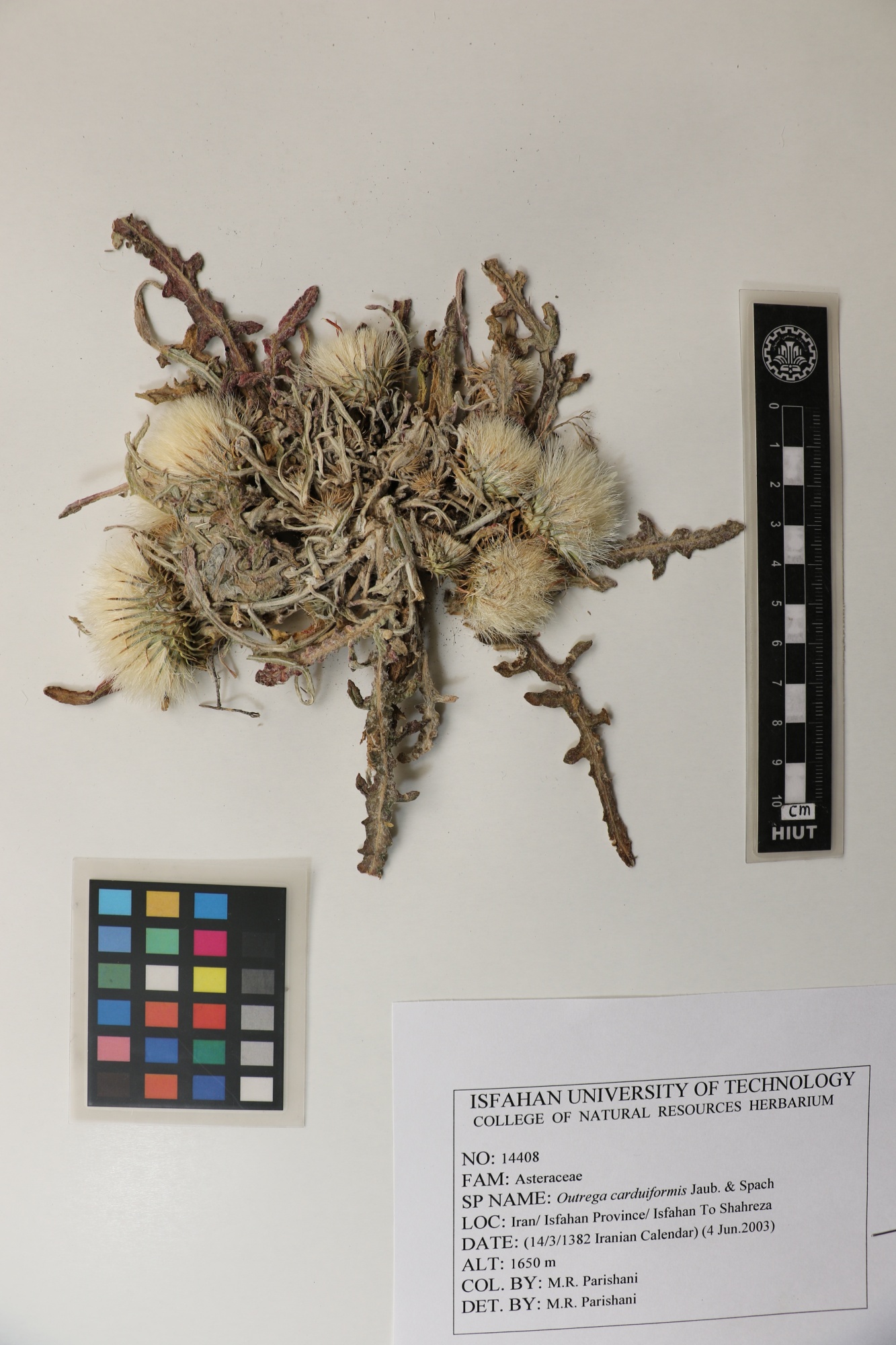 14408 Family : Asteraceae (Compositae) Herbarium Number : 14408 Species Name : Outreya carduiformis Jaub. & Spach. herbarium date 6/4/2003 herbarium alternate 1650m herbarium col by M.R.Parishani herbarium det by M.R.Parishani herbarium country Iran herbarium province Isfahan herbarium location Shah_reza herbarium lat herbarium long herbarium annotations