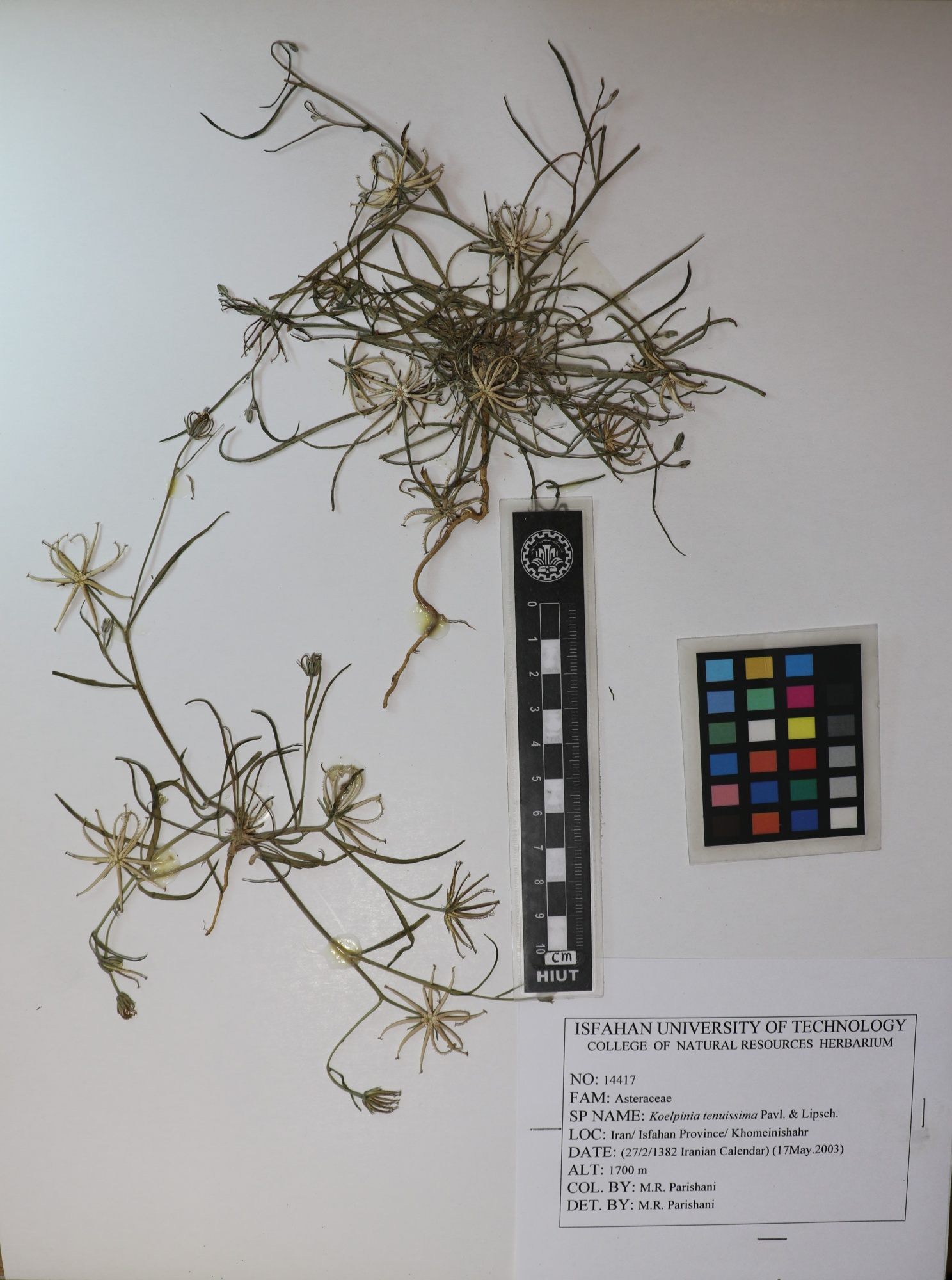 14417 Family : Asteraceae (Compositae) Herbarium Number : 14417 Species Name : Koelpinia tenuissima Pavl. & Lipsch herbarium date 3/17/2003 herbarium alternate 1700m herbarium col by M.R.Parishani herbarium det by M.R.Parishani herbarium country Iran herbarium province Isfahan herbarium location Khomeinishahr herbarium lat herbarium long herbarium annotations