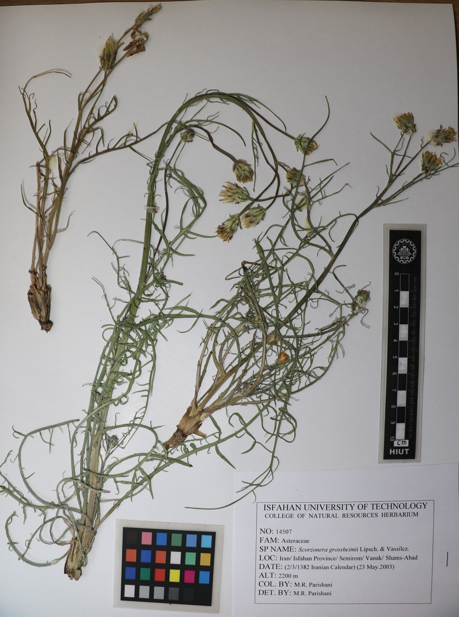 14507 Family : Asteraceae (Compositae) Herbarium Number : 14507 Species Name : Scorzonera grossheimii Lipsch. & Vassilcz. herbarium date 3/23/2003 herbarium alternate 2200m herbarium col by M.R.Parishani herbarium det by M.R.Parishani herbarium country Iran herbarium province Isfahan herbarium location Semirom herbarium lat herbarium long herbarium annotations