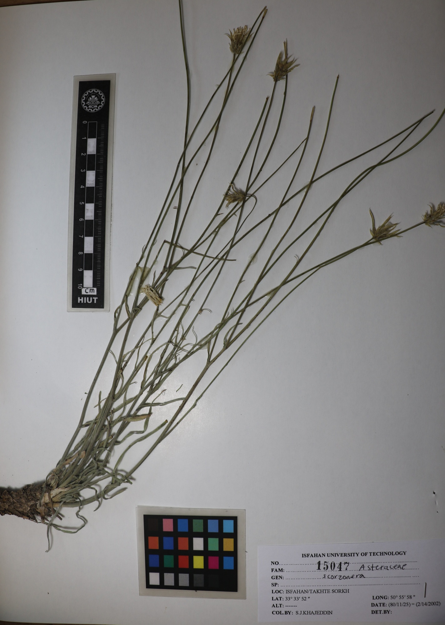 15047 Family : Asteraceae (Compositae) Herbarium Number : 15047 Species Name : Scorzonera herbarium date 2/14/2002 herbarium alternate herbarium col by S.J.Khajeddin herbarium det by herbarium country Iran herbarium province Isfahan herbarium location Takhte sorkh herbarium lat herbarium long herbarium annotations