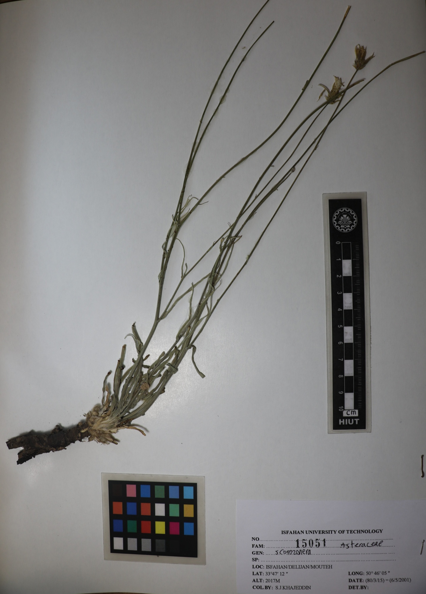 15051 Family : Asteraceae (Compositae) Herbarium Number : 15051 Species Name : Scorzonera herbarium date 5/6/2001 herbarium alternate 2107m herbarium col by S.J.Khajeddin herbarium det by herbarium country Iran herbarium province Isfahan herbarium location Delijan/Mouteh herbarium lat herbarium long herbarium annotations