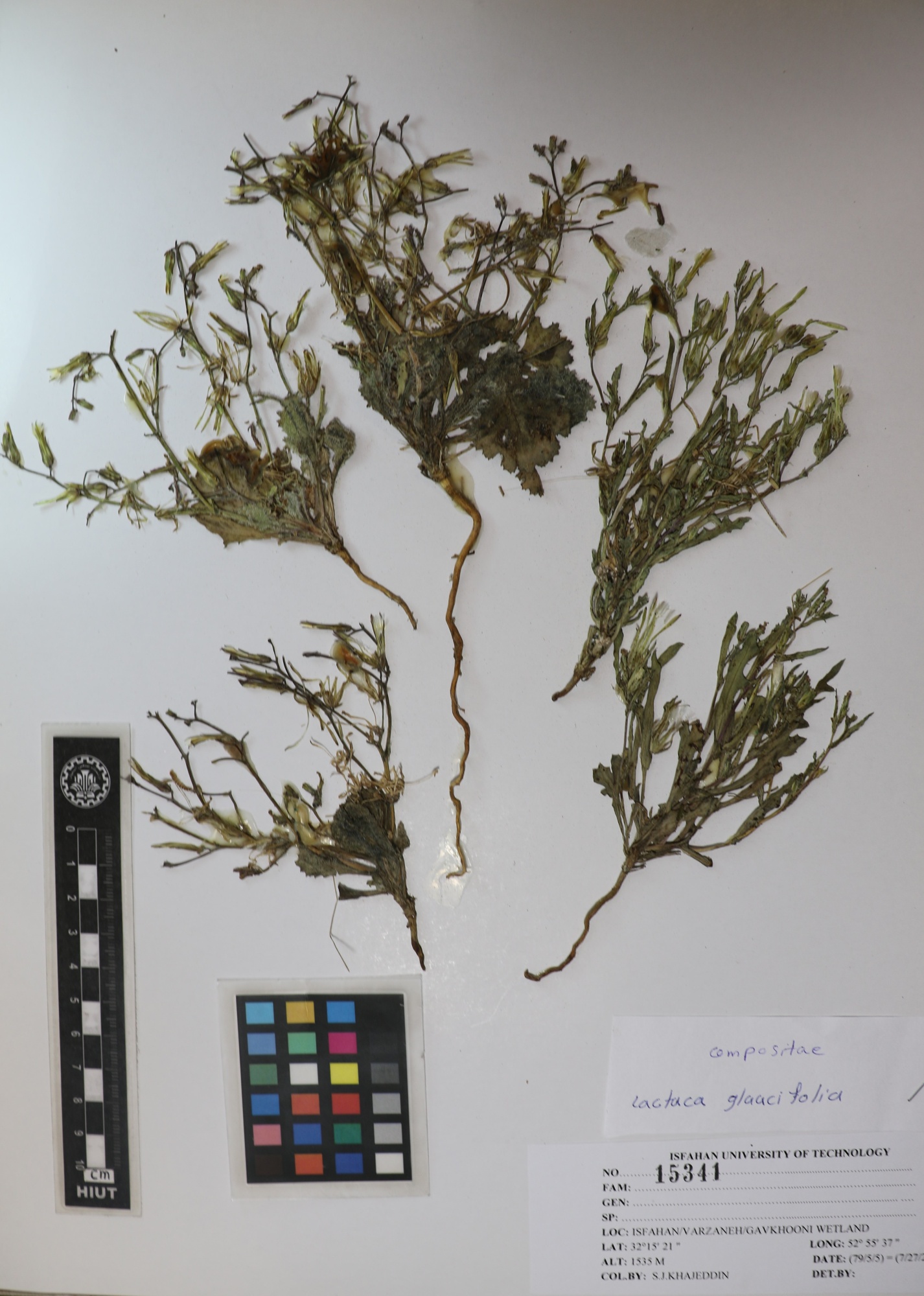 15341 Family : Asteraceae (Compositae) Herbarium Number : 15341 Species Name : Lactuca glaucifolia herbarium date 7/26/2000 herbarium alternate 1535m herbarium col by S.J.Khajeddin herbarium det by herbarium country Iran herbarium province Isfahan herbarium location Varzaneh herbarium lat herbarium long herbarium annotations