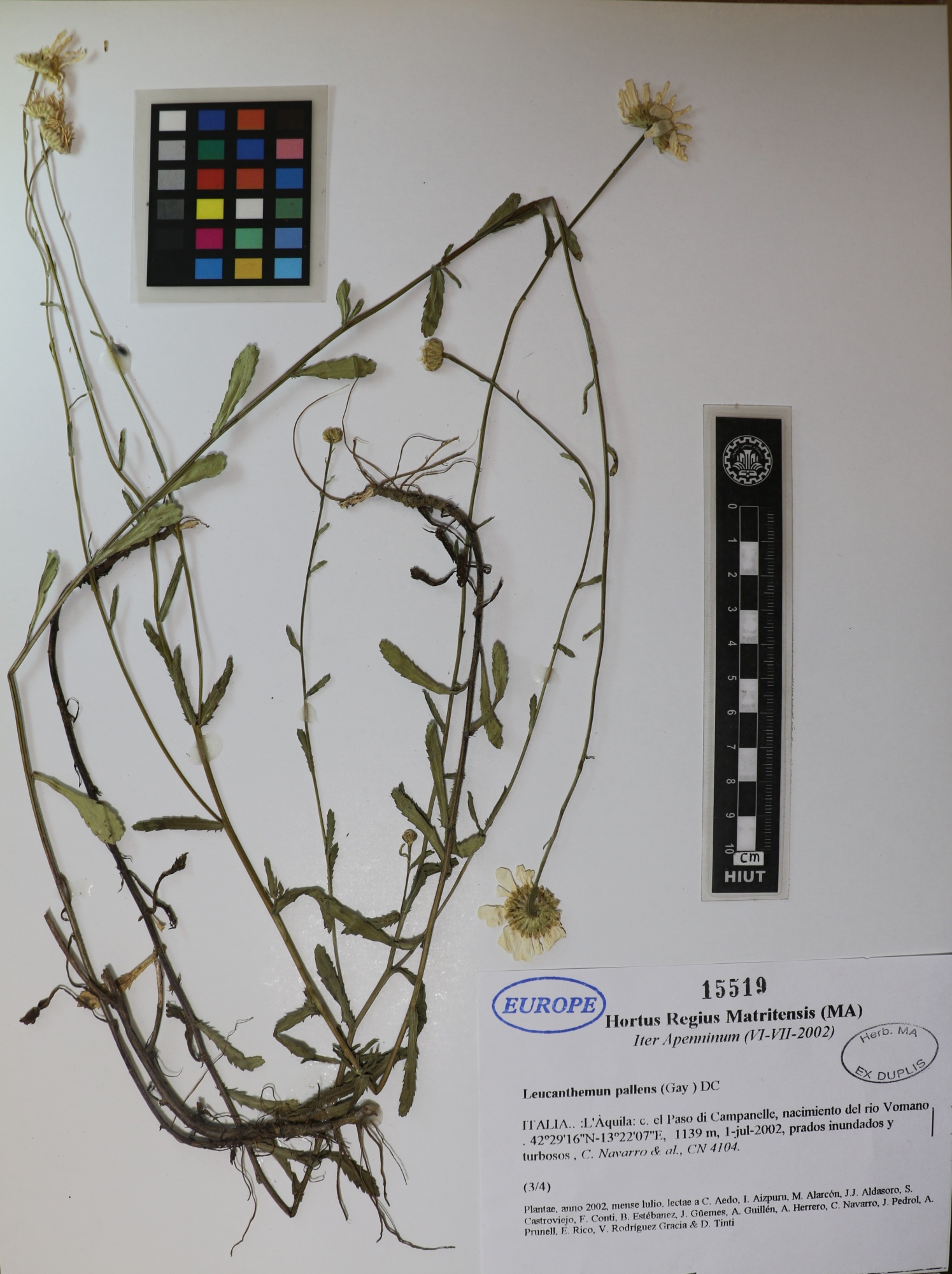 15519 Family : Asteraceae (Compositae) Herbarium Number : 15519 Species Name : Leucanthemun pallens (Gay)DC herbarium date not inserted herbarium alternate herbarium col by herbarium det by E.Rojan herbarium country Europe herbarium province herbarium location not inserted herbarium lat herbarium long herbarium annotations