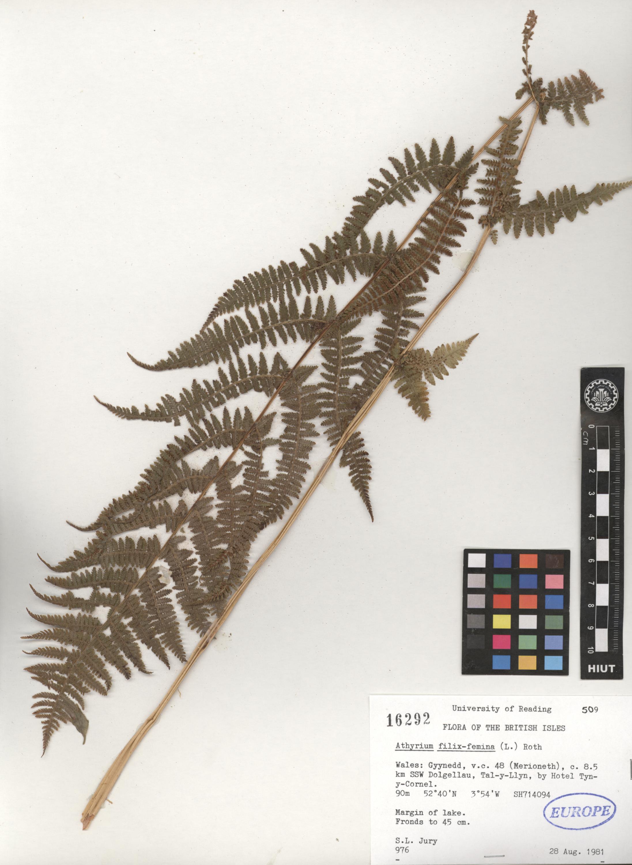 16292 Family : Athyriaceae Herbarium Number : 16292 Species Name : Athyrium filix-femina (L.) Roth herbarium date 8/28/1981 herbarium alternate 90m herbarium col by herbarium det by herbarium country Wales herbarium province Gyyned herbarium location not inserted herbarium lat herbarium long herbarium annotations