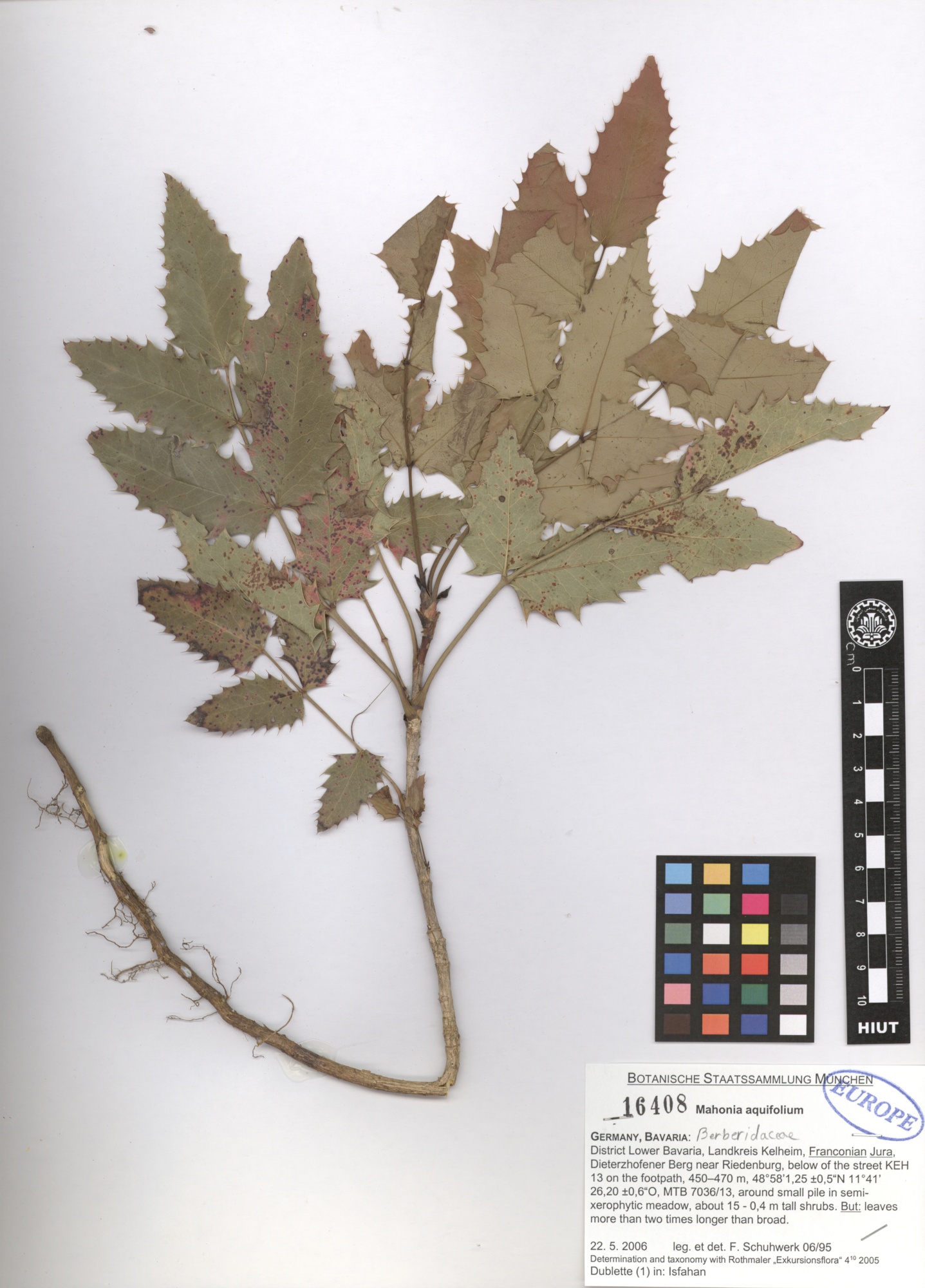 16408 Family : Berberidaceae Herbarium Number : 16408 Species Name : Mahonia aquifolium L. herbarium date not inserted herbarium alternate herbarium col by herbarium det by herbarium country Germany herbarium province Bavaria herbarium location not inserted herbarium lat herbarium long herbarium annotations