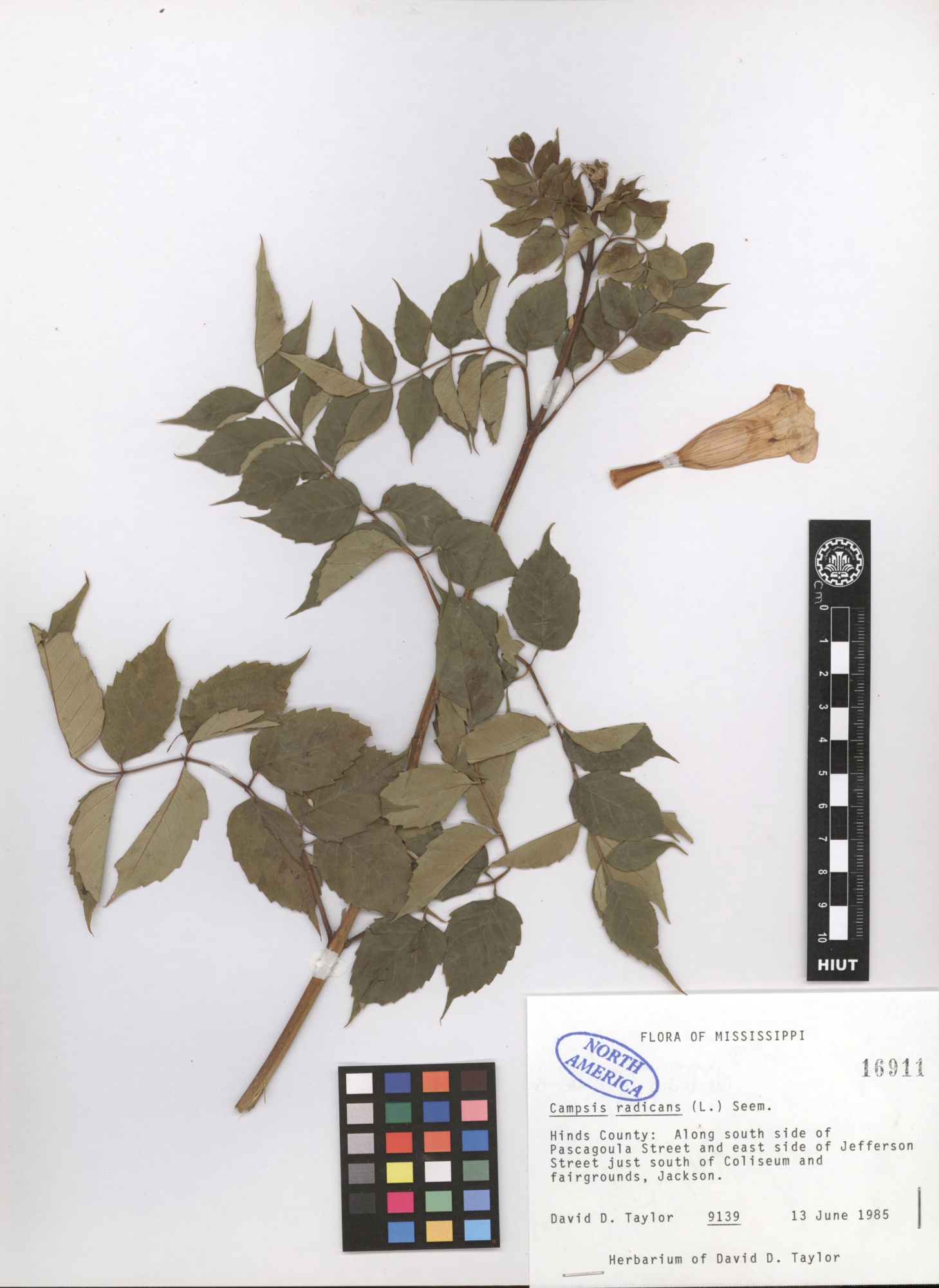 16911 Family : Bignoniaceae Herbarium Number : 16911 Species Name : Campsis radicans (L.) Seem. herbarium date not inserted herbarium alternate herbarium col by herbarium det by herbarium country NorthAmerica herbarium province herbarium location not inserted herbarium lat herbarium long herbarium annotations