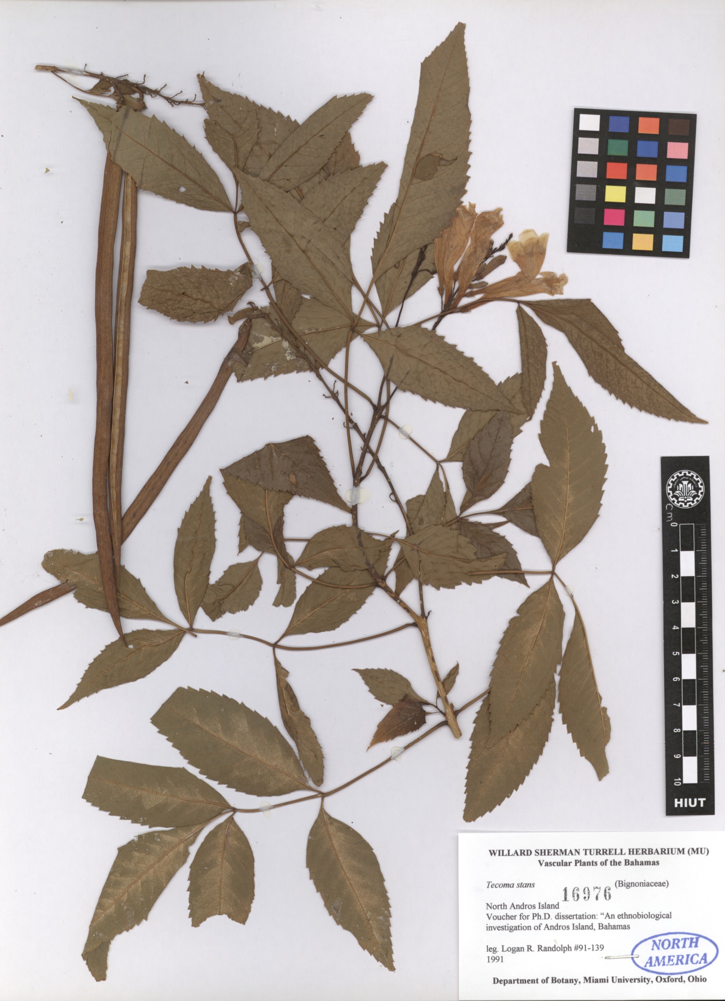 16976 Family : Bignoniaceae Herbarium Number : 16976 Species Name : Tecoma stans (L.) herbarium date not inserted herbarium alternate herbarium col by herbarium det by herbarium country NorthAmerica herbarium province herbarium location not inserted herbarium lat herbarium long herbarium annotations