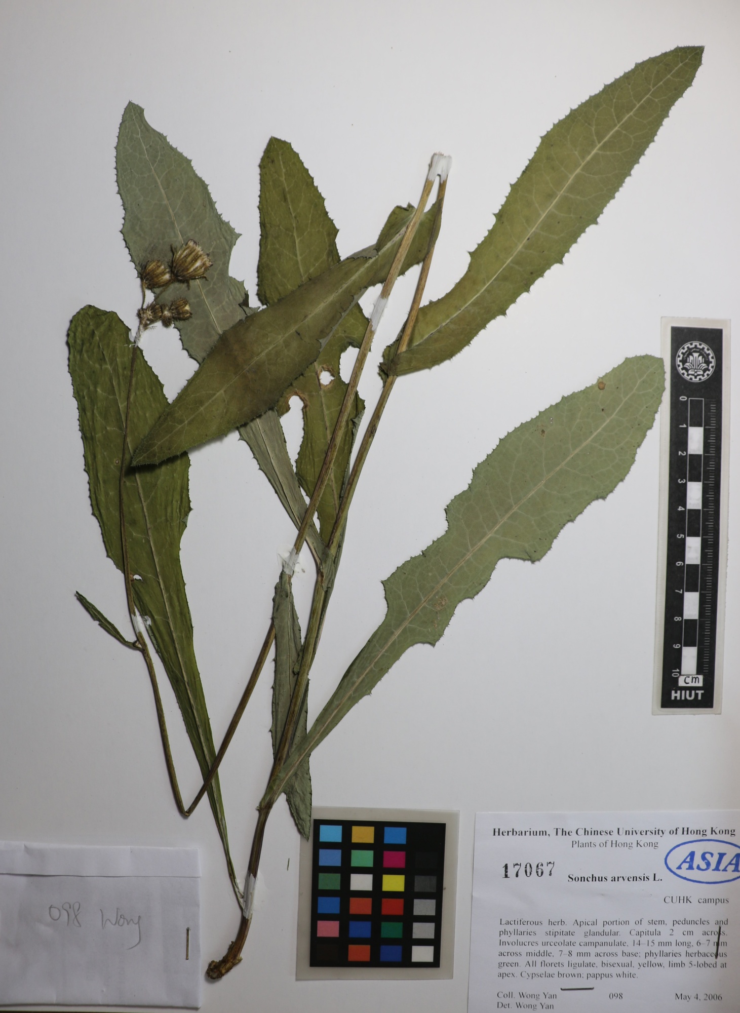 17067 Family : Asteraceae (Compositae) Herbarium Number : 17067 Species Name : Sonchus arvensis L. herbarium date 3/4/2006 herbarium alternate herbarium col by herbarium det by herbarium country Asia herbarium province herbarium location not inserted herbarium lat herbarium long herbarium annotations
