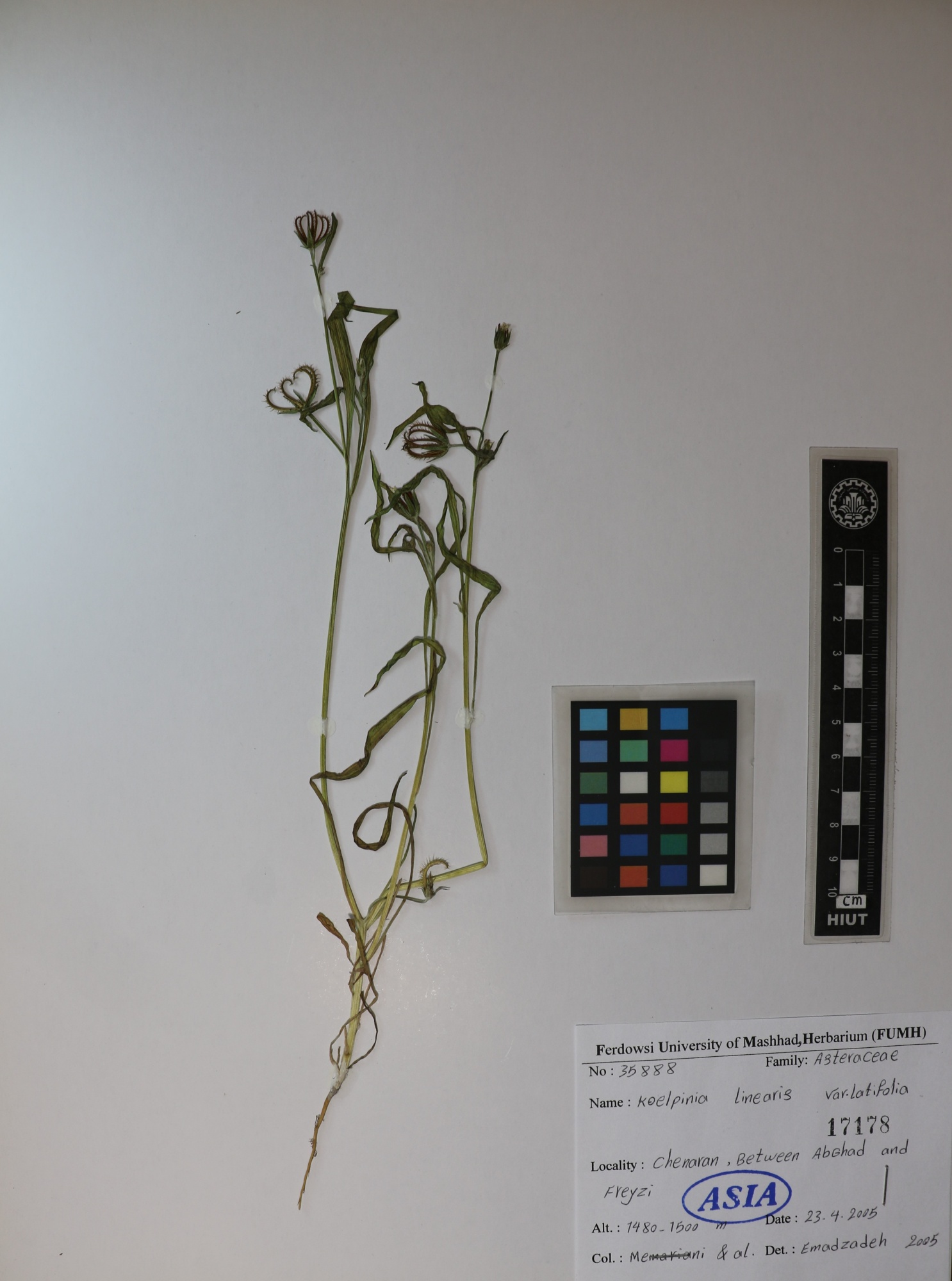 17178 Family : Asteraceae (Compositae) Herbarium Number : 17178 Species Name : Koelpinia linearis Latifolia herbarium date 4/23/2005 herbarium alternate 1480_1500m herbarium col by Memarian & Al. herbarium det by Emadzadeh herbarium country Iran herbarium province Khorasan herbarium location Chenaran herbarium lat herbarium long herbarium annotations