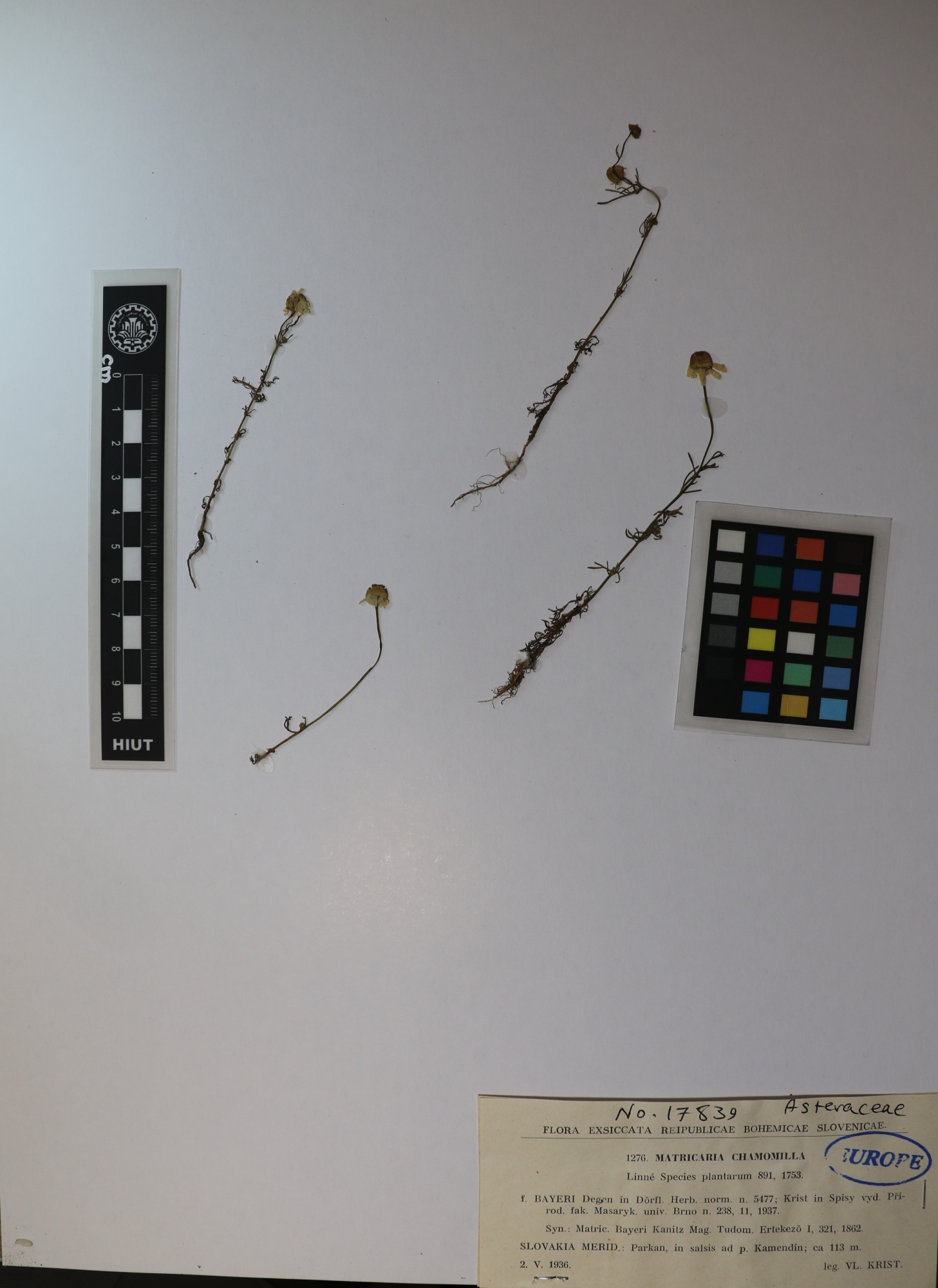 17839 Family : Asteraceae (Compositae) Herbarium Number : 17839 Species Name : Matricaria chamomilla herbarium date not inserted herbarium alternate herbarium col by herbarium det by herbarium country Europe herbarium province herbarium location not inserted herbarium lat herbarium long herbarium annotations