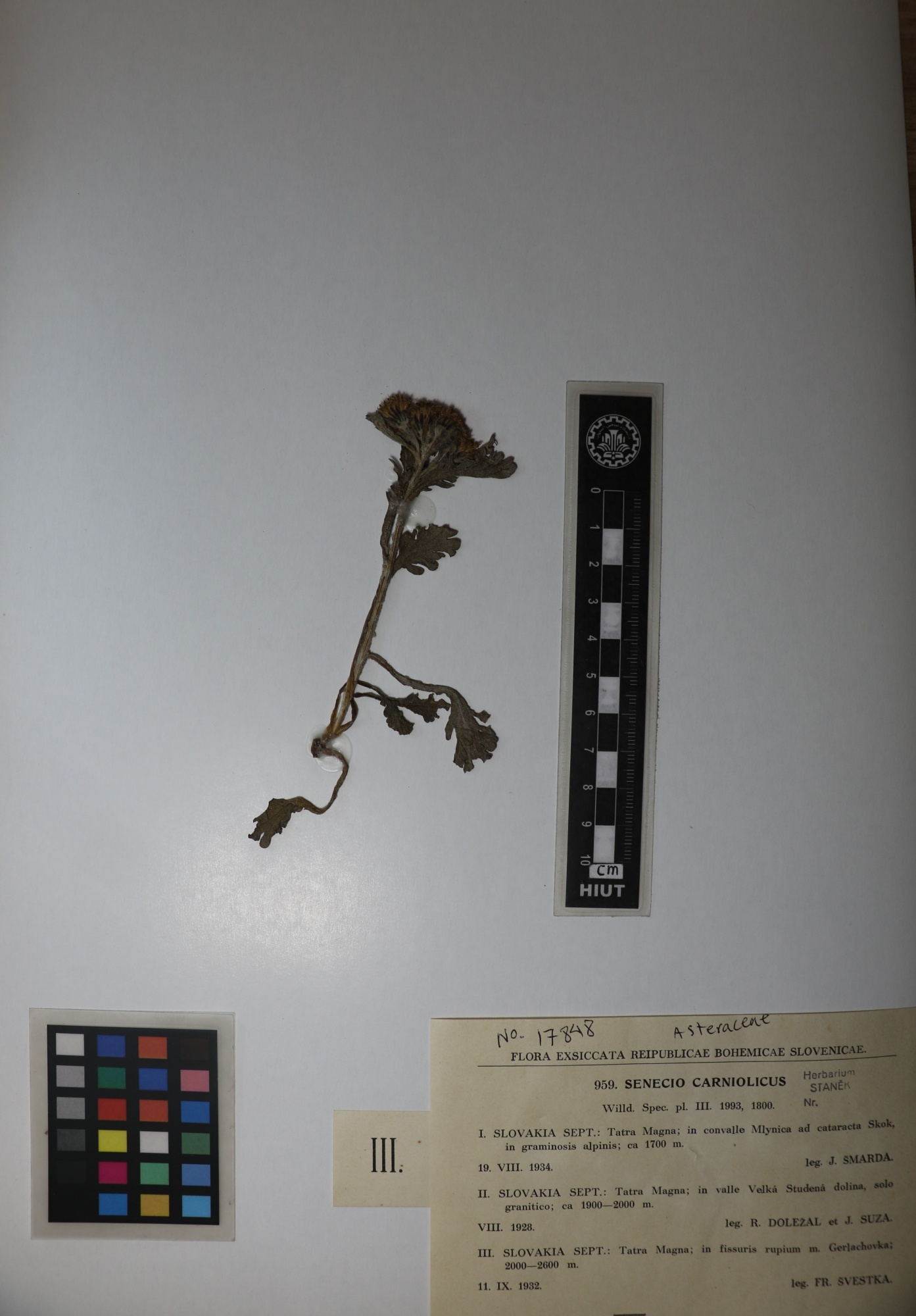 17848 Family : Asteraceae (Compositae) Herbarium Number : 17848 Species Name : Senecio carniolicus herbarium date not inserted herbarium alternate herbarium col by herbarium det by herbarium country Europe herbarium province herbarium location not inserted herbarium lat herbarium long herbarium annotations