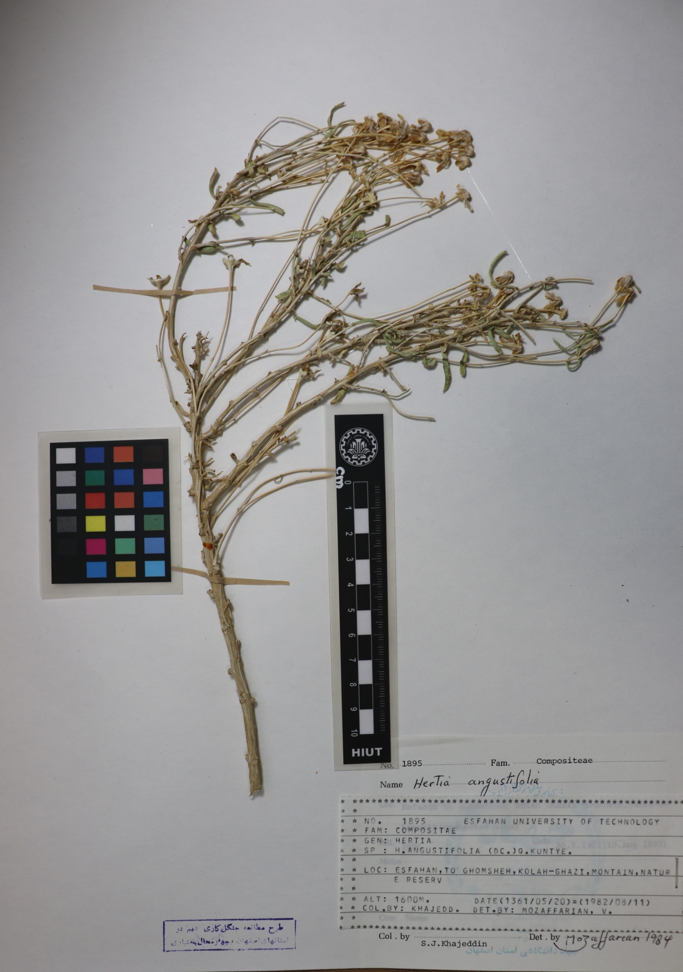 1895 Family : Asteraceae (Compositae) Herbarium Number : 1895 Species Name : Hertia angustifolia (Dc.)Q.Kuntye. herbarium date 8/11/1982 herbarium alternate 1600m herbarium col by S.J.Khajeddin herbarium det by M.Nowroozi herbarium country Iran herbarium province Isfahan herbarium location Kolah_ghazi,mountain herbarium lat herbarium long herbarium annotations