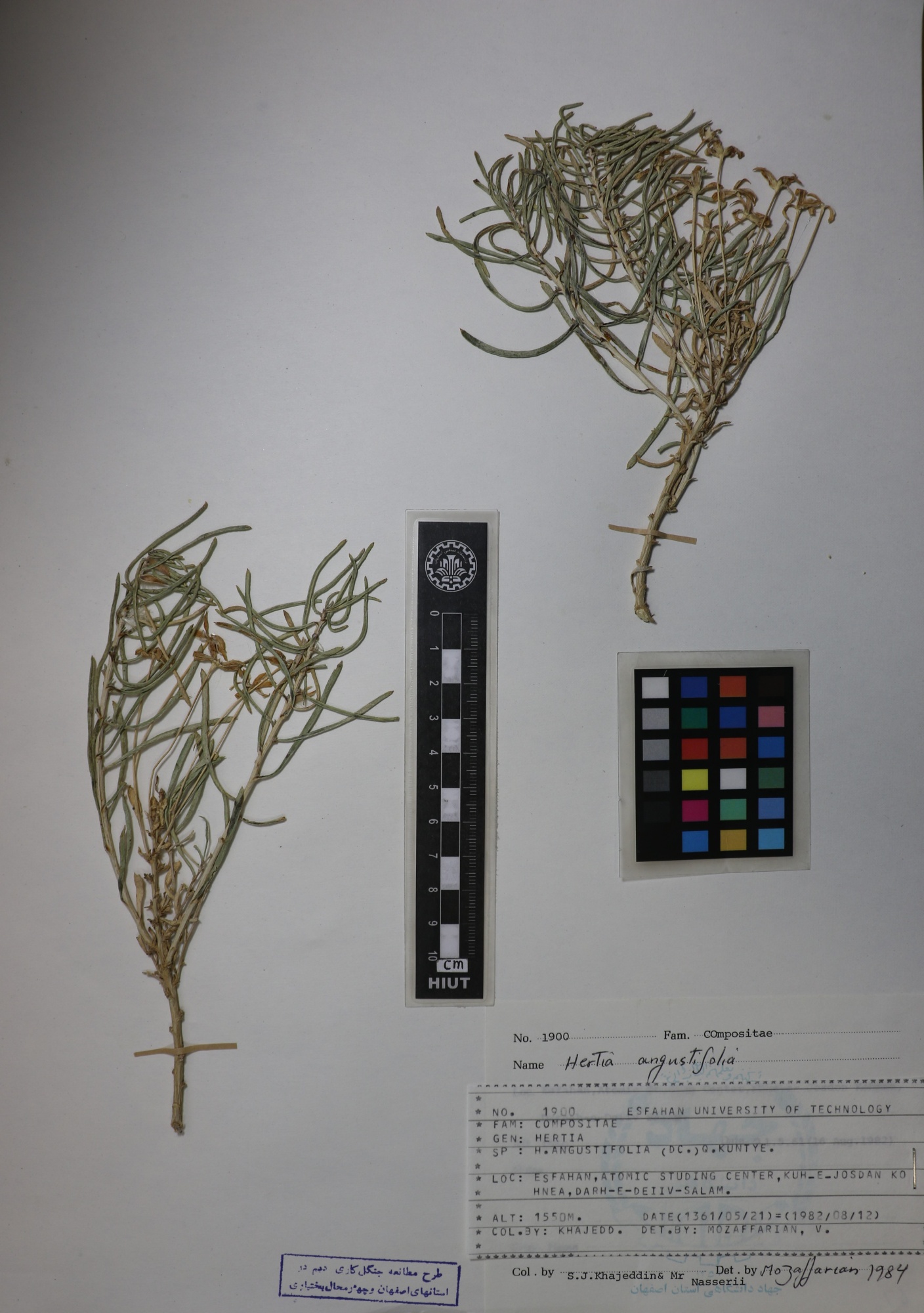 1900 Family : Asteraceae (Compositae) Herbarium Number : 1900 Species Name : Hertia angustifolia (Dc.)Q.Kuntye. herbarium date 8/12/1982 herbarium alternate 1550m herbarium col by S.J.Khajeddin herbarium det by V.Mozaffarian herbarium country Iran herbarium province Isfahan herbarium location AtomicStudingCenter herbarium lat herbarium long herbarium annotations