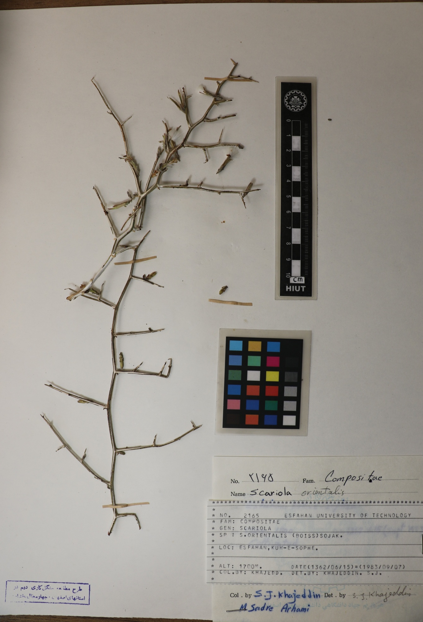 2165 Family : Asteraceae (Compositae) Herbarium Number : 2165 Species Name : Scariola orientalis (Boiss)Sojak. herbarium date 9/7/1983 herbarium alternate 1700m herbarium col by A.Nekoui herbarium det by herbarium country Iran herbarium province Isfahan herbarium location Kuh_e_sophe herbarium lat herbarium long herbarium annotations