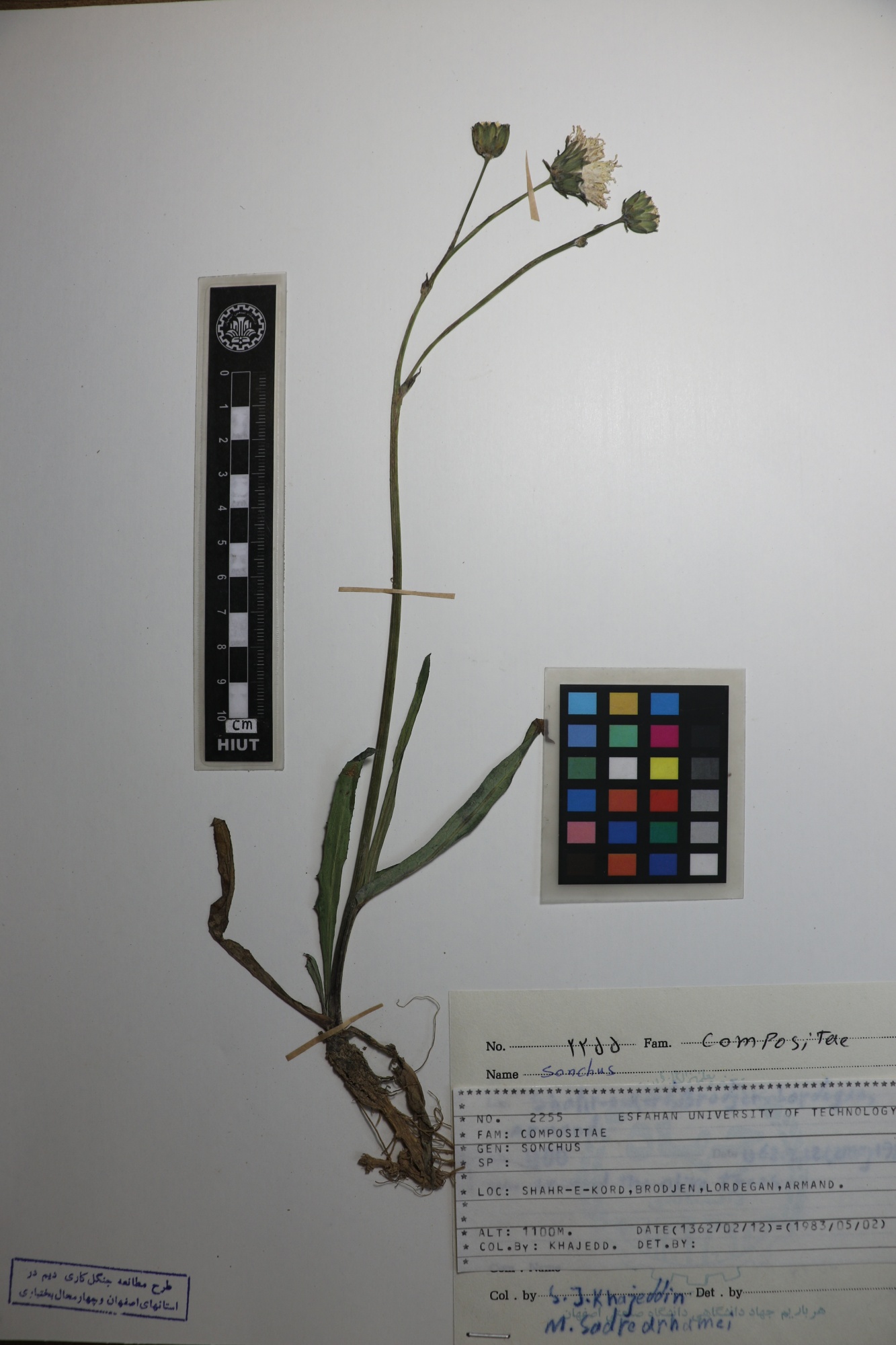 2255 Family : Asteraceae (Compositae) Herbarium Number : 2255 Species Name : Sonchus herbarium date 5/2/1983 herbarium alternate 1100m herbarium col by S.J.Khajeddin herbarium det by herbarium country Iran herbarium province Isfahan herbarium location Shahr_e_kord herbarium lat herbarium long herbarium annotations