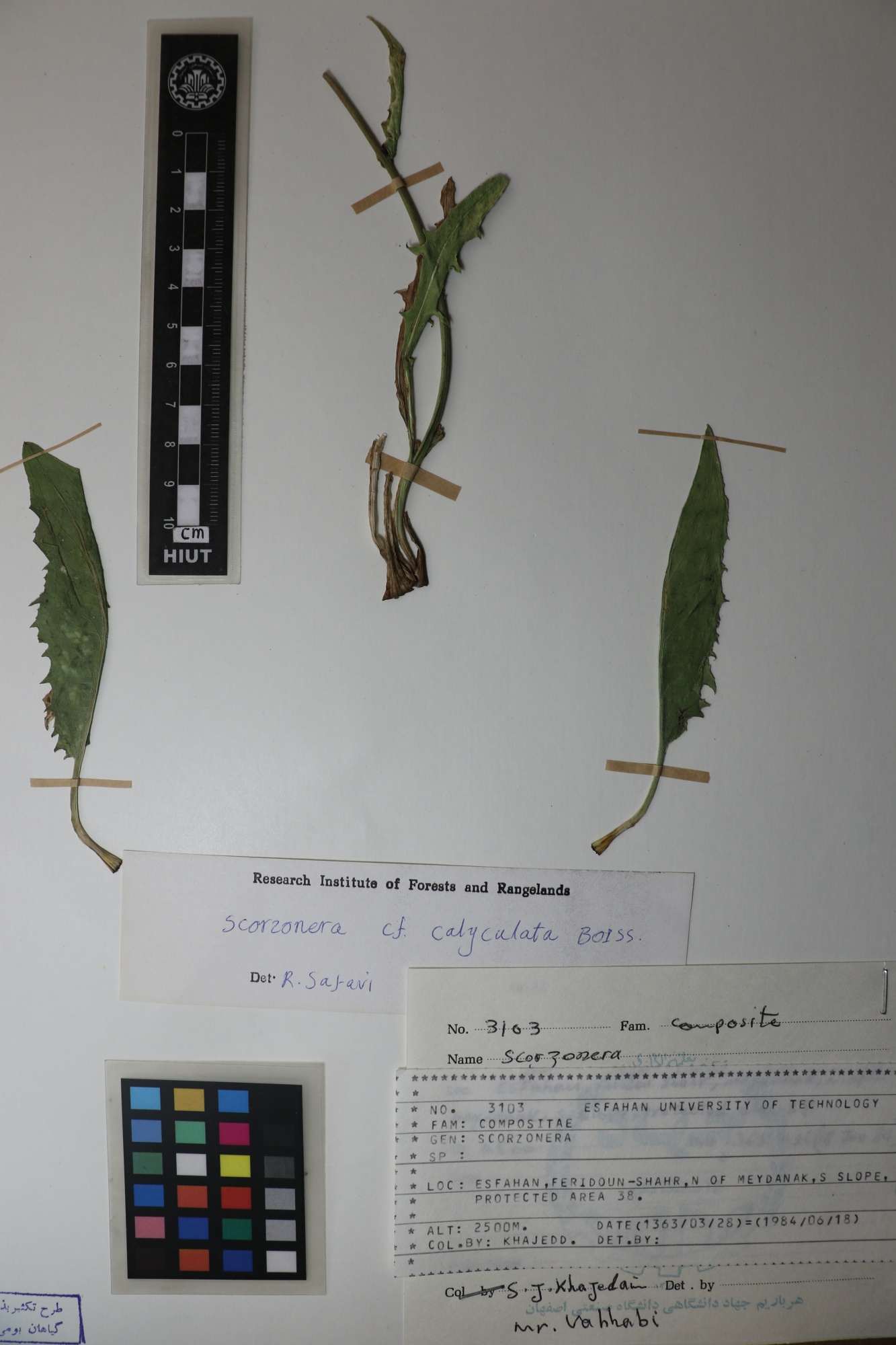 3103 Family : Asteraceae (Compositae) Herbarium Number : 3103 Species Name : Scorzonera calyculata Boiss. herbarium date 6/18/1984 herbarium alternate 2500m herbarium col by S.J.Khajeddin herbarium det by herbarium country Iran herbarium province Isfahan herbarium location Feridoun_Shahr herbarium lat herbarium long herbarium annotations