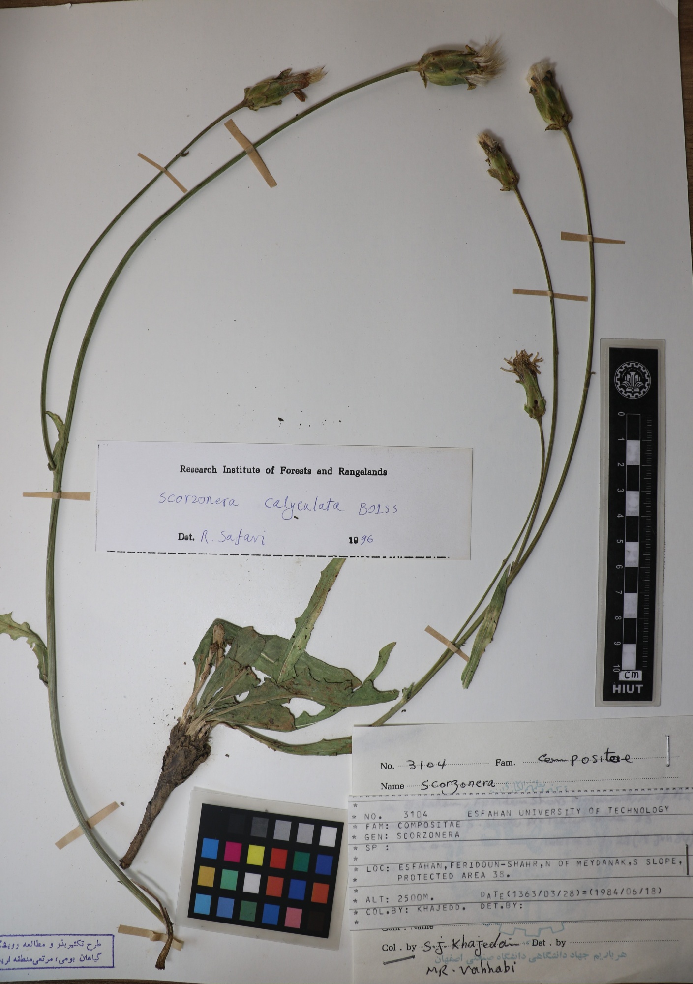 3104 Family : Asteraceae (Compositae) Herbarium Number : 3104 Species Name : Scorzonera calyculata Boiss herbarium date 6/8/1984 herbarium alternate 2500m herbarium col by S.J.Khajeddin herbarium det by herbarium country Iran herbarium province Isfahan herbarium location Feridoun_Shahr herbarium lat herbarium long herbarium annotations