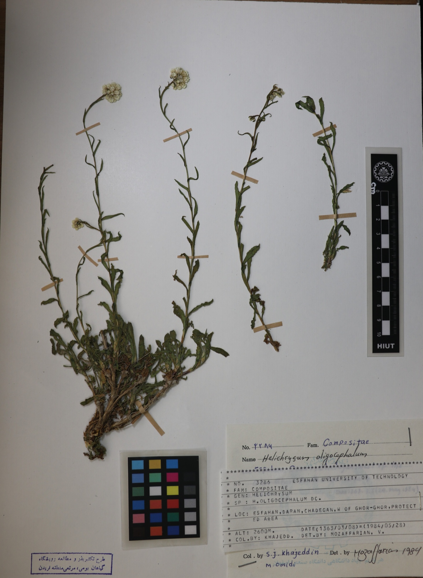 3286 Family : Asteraceae (Compositae) Herbarium Number : 3286 Species Name : Helichrysum oligocephalum Dc. herbarium date 5/28/1984 herbarium alternate 2600m herbarium col by S.J.Khajeddin herbarium det by herbarium country Iran herbarium province Isfahan herbarium location Daran,Chadegan herbarium lat herbarium long herbarium annotations