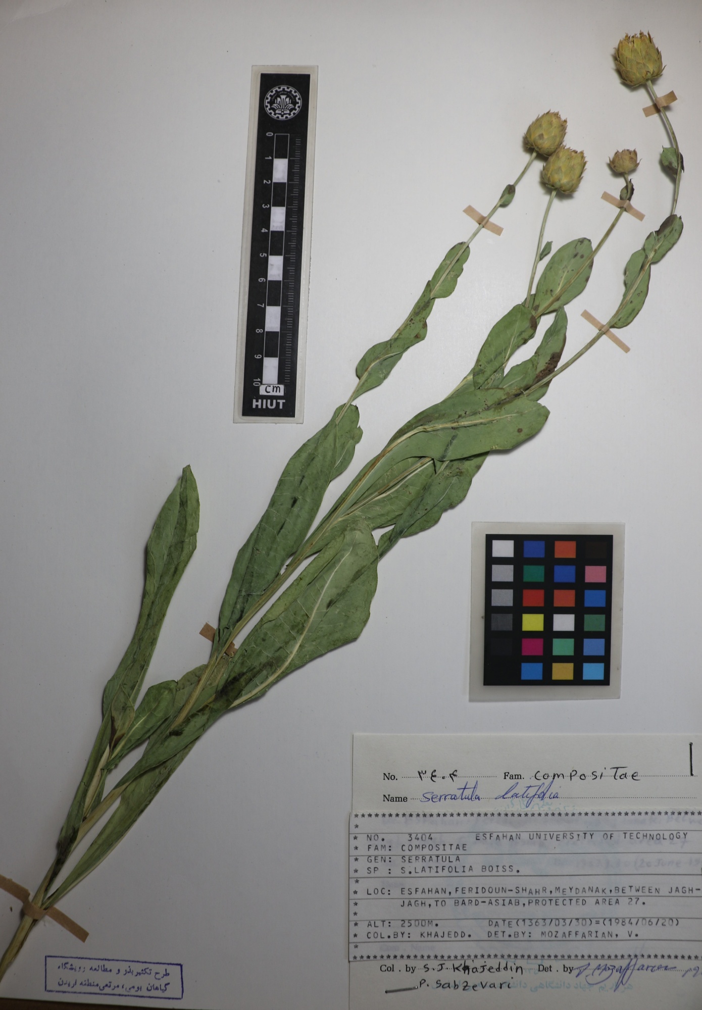 3404 Family : Asteraceae (Compositae) Herbarium Number : 3404 Species Name : Serratula latifolia Boiss. herbarium date 6/20/1984 herbarium alternate 2500m herbarium col by S.J.Khajeddin herbarium det by herbarium country Iran herbarium province Isfahan herbarium location Feridoun_Shahr herbarium lat herbarium long herbarium annotations
