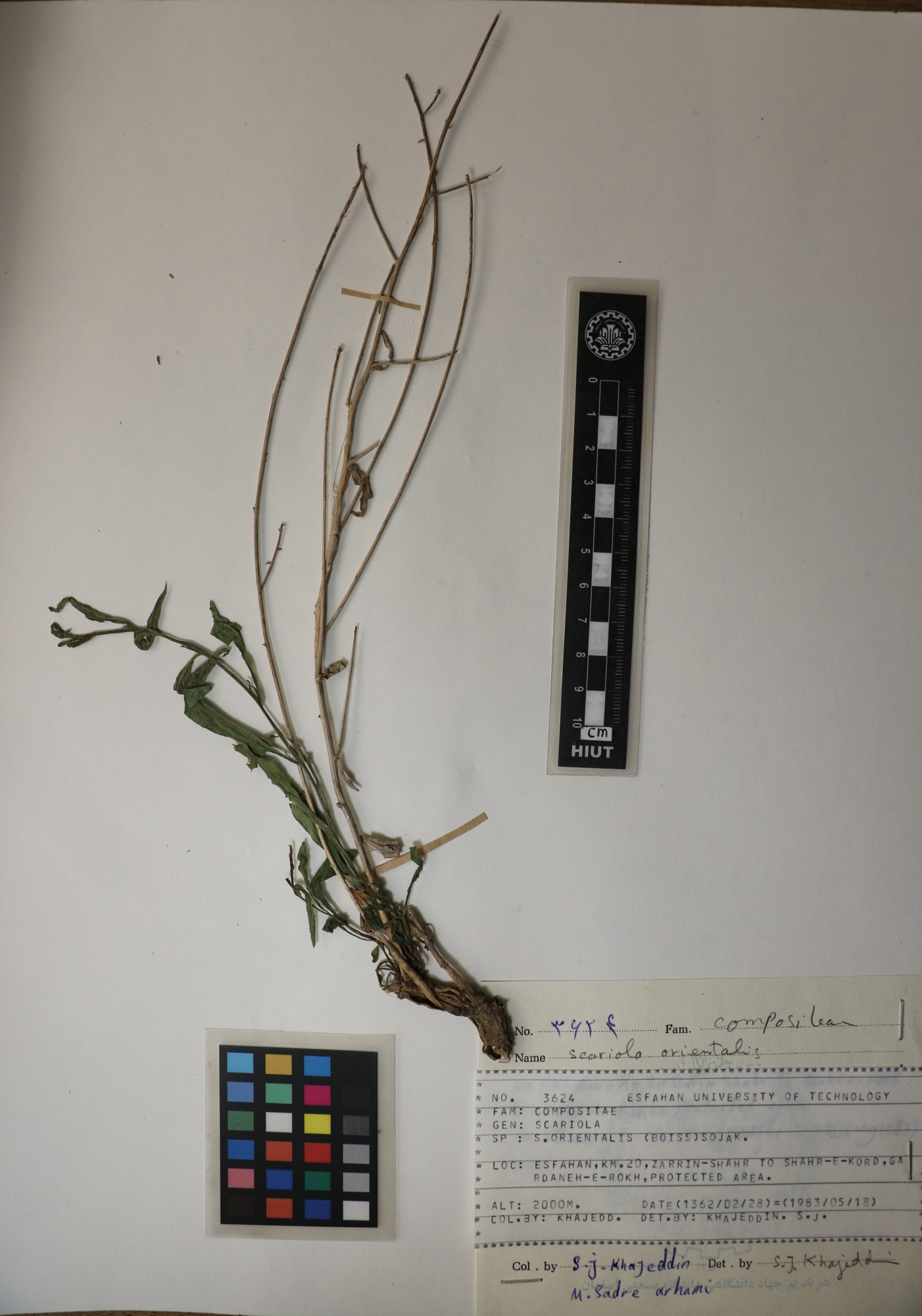 3624 Family : Asteraceae (Compositae) Herbarium Number : 3624 Species Name : Scariola orientalis (Boiss)Sojak. herbarium date 5/18/1983 herbarium alternate 2000m herbarium col by S.J.Khajeddin herbarium det by herbarium country Iran herbarium province Isfahan herbarium location Zarrin_Shahr herbarium lat herbarium long herbarium annotations