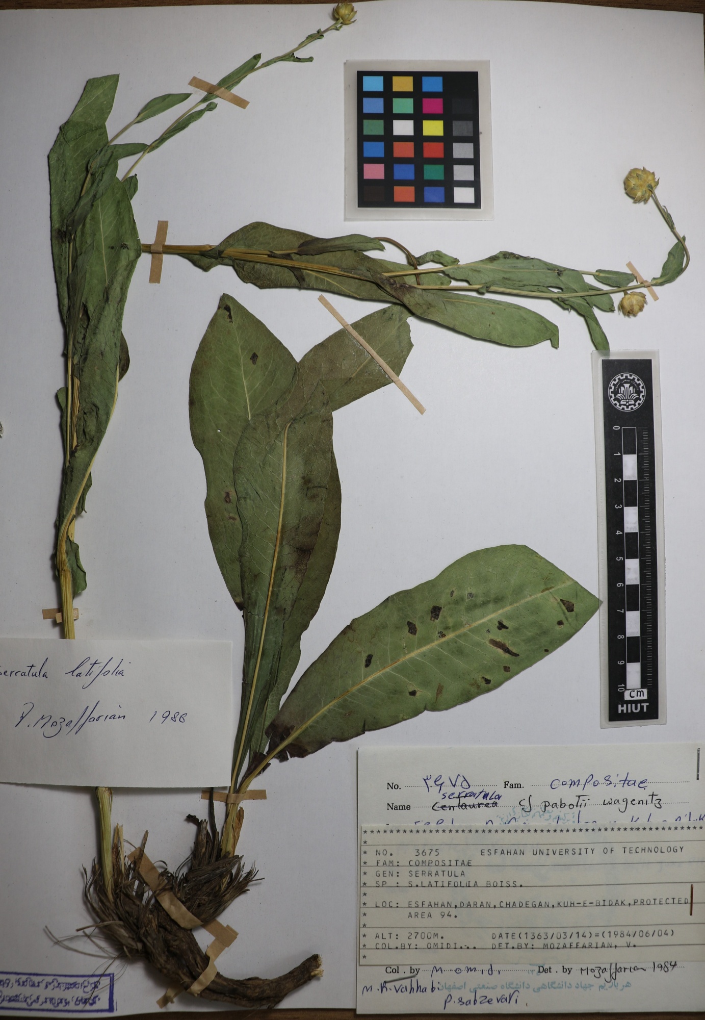 3675 Family : Asteraceae (Compositae) Herbarium Number : 3675 Species Name : Serratula latifolia Boiss. herbarium date 6/4/1984 herbarium alternate 2700m herbarium col by S.J.Khajeddin herbarium det by herbarium country Iran herbarium province Isfahan herbarium location Daran,Chadegan herbarium lat herbarium long herbarium annotations