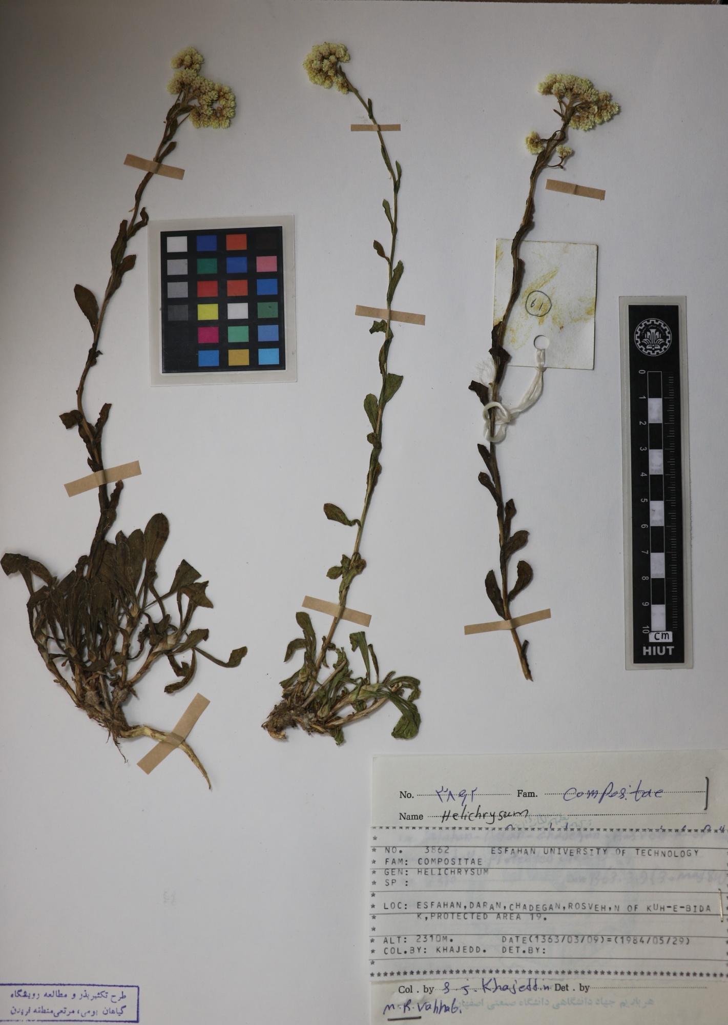 3862 Family : Asteraceae (Compositae) Herbarium Number : 3862 Species Name : Helichrysum herbarium date 5/29/1984 herbarium alternate 2310m herbarium col by S.J.Khajeddin herbarium det by V.Mozaffarian herbarium country Iran herbarium province Isfahan herbarium location Daran,Chadegan herbarium lat herbarium long herbarium annotations