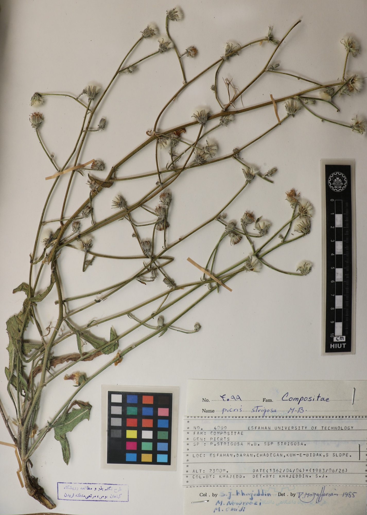 4099 Family : Asteraceae (Compositae) Herbarium Number : 4099 Species Name : Picris strigosa M.B.Ssp strigosa herbarium date 6/26/1983 herbarium alternate 2300m herbarium col by S.J.Khajeddin herbarium det by M.Nowroozi herbarium country Iran herbarium province Isfahan herbarium location Daran,Chadegan herbarium lat herbarium long herbarium annotations