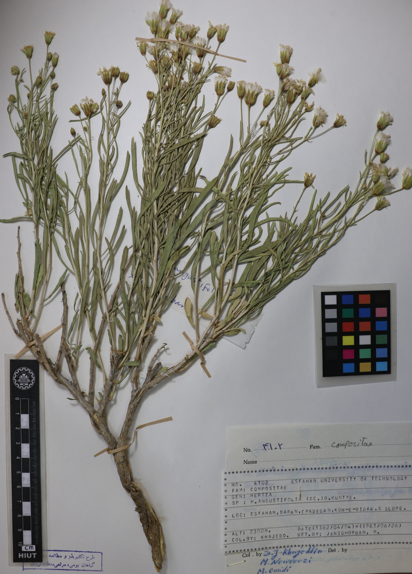 4102 Family : Asteraceae (Compositae) Herbarium Number : 4102 Species Name : Hertia angustifolia (Dc.)Q.Kuntye. herbarium date 6/26/1983 herbarium alternate 2300m herbarium col by S.J.Khajeddin herbarium det by V.Mozaffarian herbarium country Iran herbarium province Isfahan herbarium location Daran,Chadegan herbarium lat herbarium long herbarium annotations