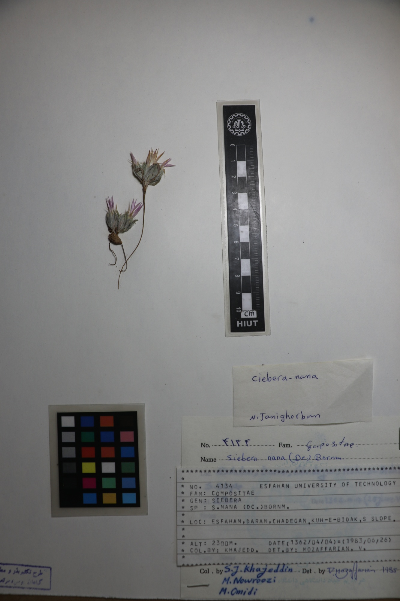 4134 Family : Asteraceae (Compositae) Herbarium Number : 4134 Species Name : Siebera nana (Dc.)Bornm. herbarium date 6/26/1983 herbarium alternate herbarium col by S.J.Khajeddin herbarium det by herbarium country Iran herbarium province Isfahan herbarium location Daran,Chadegan herbarium lat herbarium long herbarium annotations