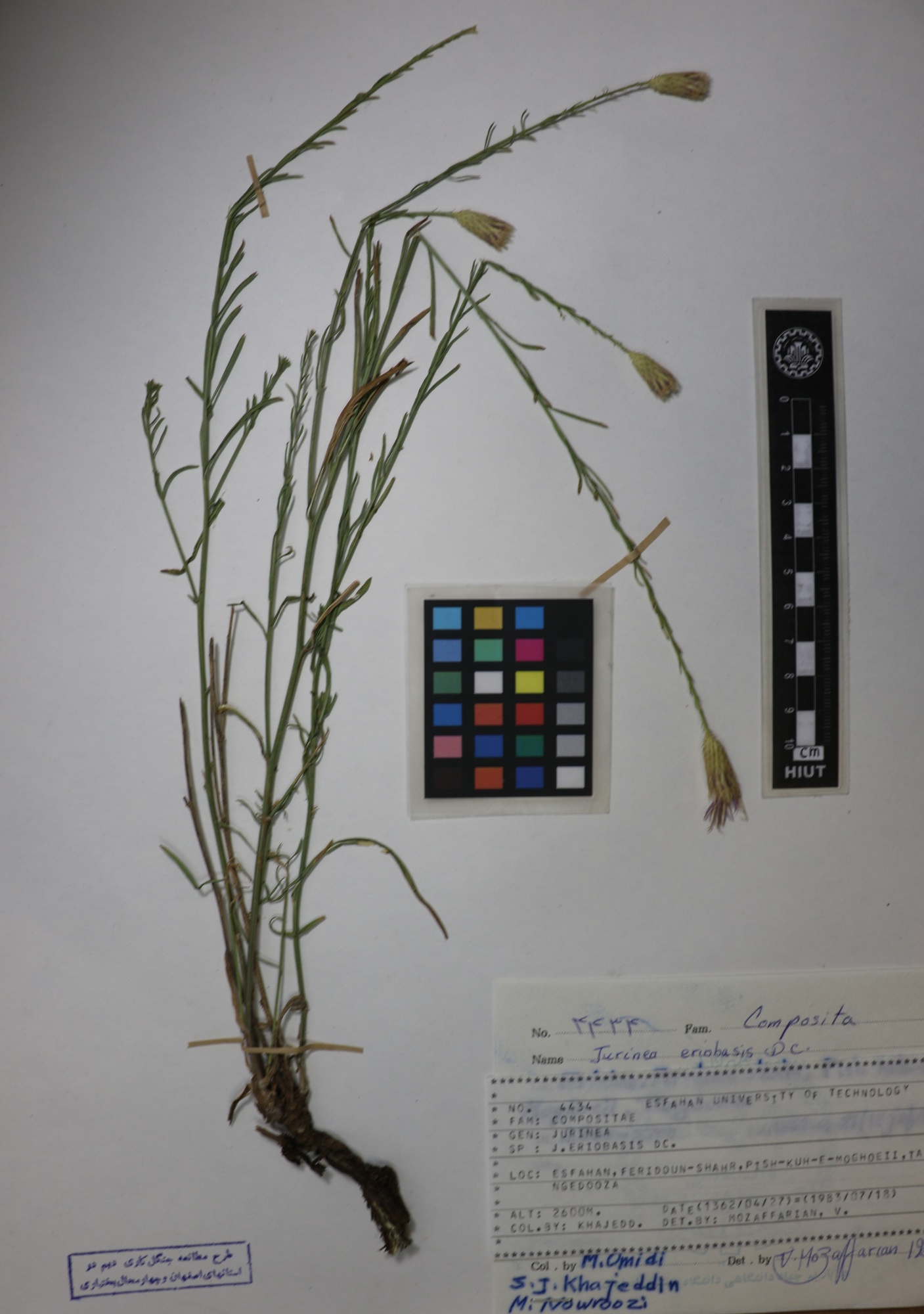 4434 Family : Asteraceae (Compositae) Herbarium Number : 4434 Species Name : Jurinea eriobasis Dc. herbarium date 7/18/1983 herbarium alternate 2600m herbarium col by S.J.Khajeddin herbarium det by herbarium country Iran herbarium province Isfahan herbarium location Feridoun_Shahr herbarium lat herbarium long herbarium annotations