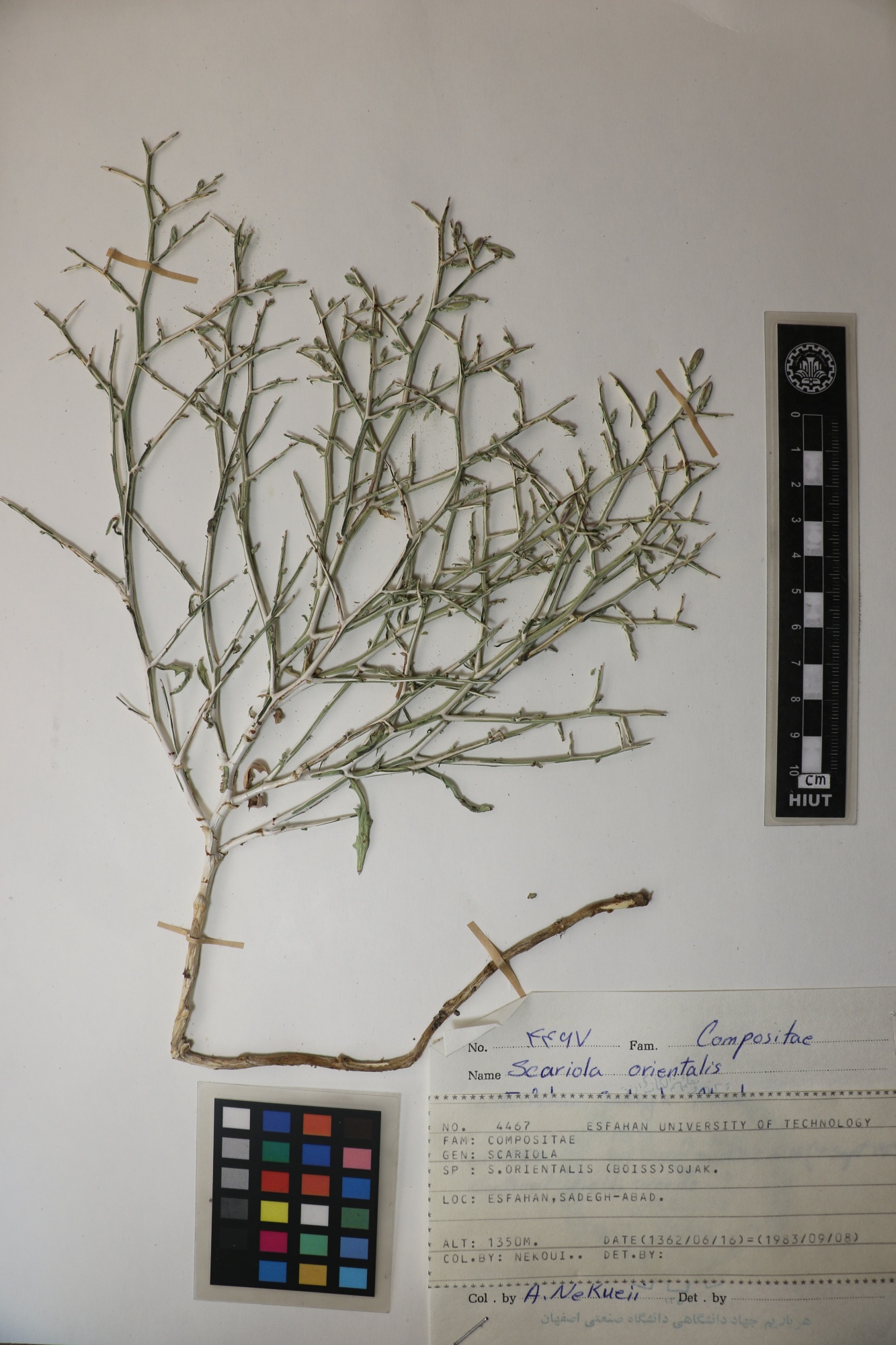 4467 Family : Asteraceae (Compositae) Herbarium Number : 4467 Species Name : Scariola orientalis (Boiss)Sojak. herbarium date 9/8/1983 herbarium alternate 1350m herbarium col by A.Nekoui herbarium det by herbarium country Iran herbarium province Isfahan herbarium location Sadegh_Abad herbarium lat herbarium long herbarium annotations