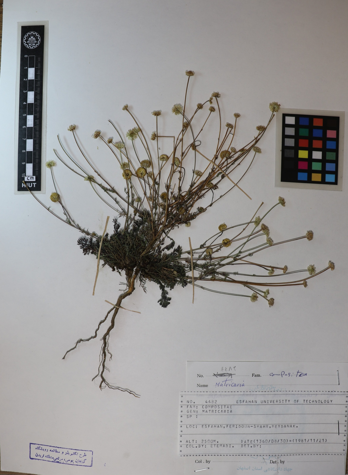 4482 Family : Asteraceae (Compositae) Herbarium Number : 4482 Species Name : Matricaria herbarium date 11/21/1981 herbarium alternate 2500m herbarium col by S.J.Khajeddin herbarium det by V.Mozaffarian herbarium country Iran herbarium province Isfahan herbarium location Feridoun_Shahr herbarium lat herbarium long herbarium annotations