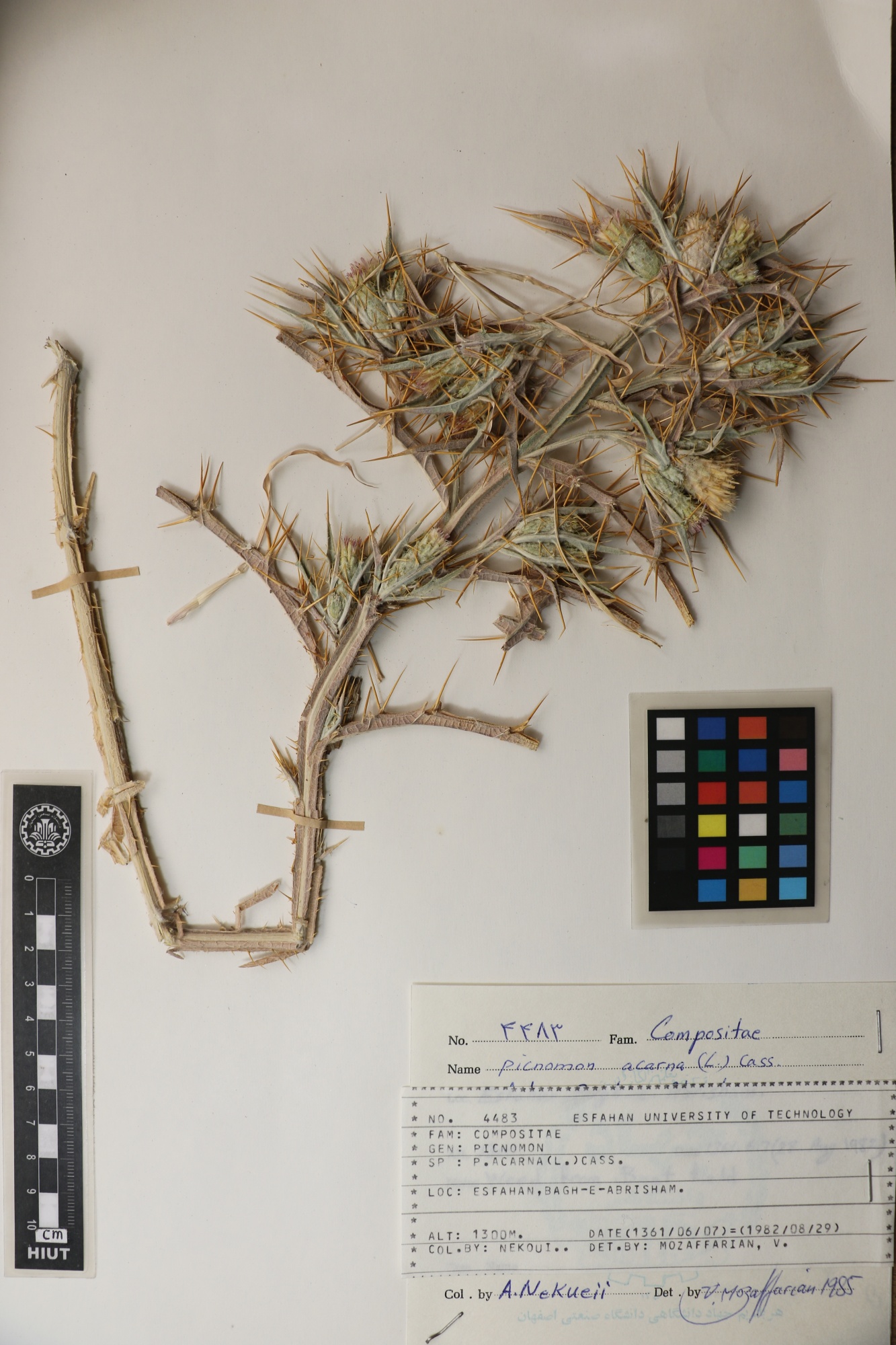 4483 Family : Asteraceae (Compositae) Herbarium Number : 4483 Species Name : Picnomon acarna (L.)Cass. herbarium date 8/29/1982 herbarium alternate 1300m herbarium col by N.Etemadi herbarium det by herbarium country Iran herbarium province Isfahan herbarium location Bagh_e_abrisham herbarium lat herbarium long herbarium annotations