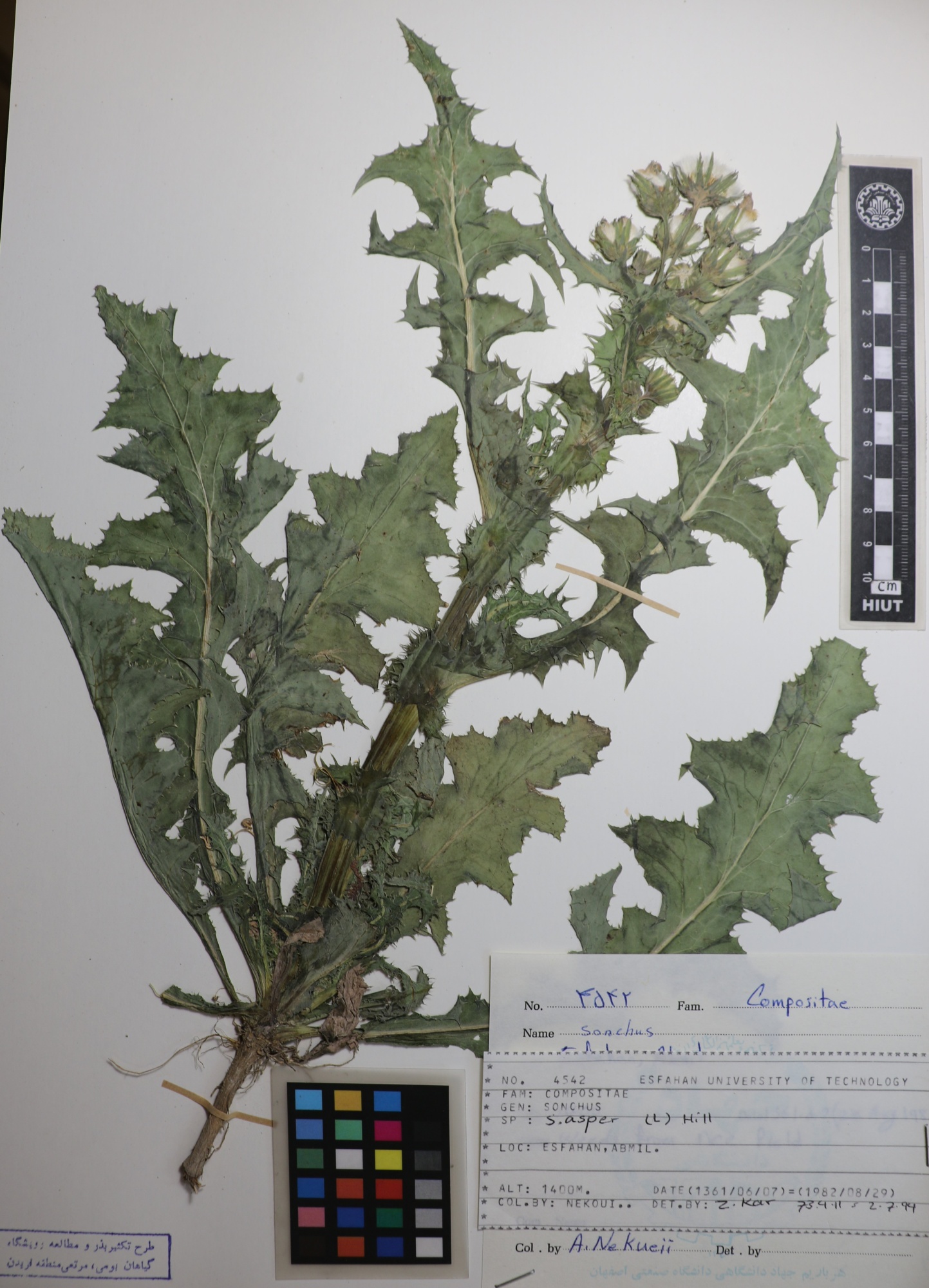4542 Family : Asteraceae (Compositae) Herbarium Number : 4542 Species Name : Sonchus asper (h.)Hill herbarium date 8/29/1982 herbarium alternate herbarium col by A.Nekoui herbarium det by Z.Kar herbarium country Iran herbarium province Isfahan herbarium location Abmil. herbarium lat herbarium long herbarium annotations