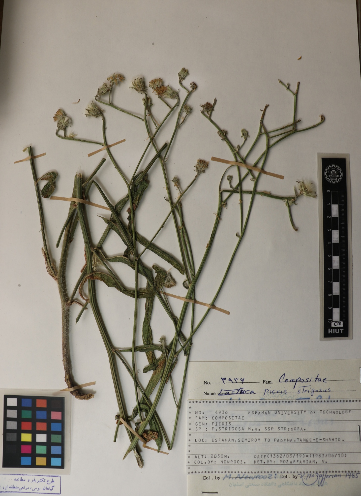 4936 Family : Asteraceae (Compositae) Herbarium Number : 4936 Species Name : Picris strigosa M.B.Ssp strigosa herbarium date 6/10/1983 herbarium alternate 2050m herbarium col by S.J.Khajeddin herbarium det by V.Mozaffarian herbarium country Iran herbarium province Isfahan herbarium location Semirom herbarium lat herbarium long herbarium annotations